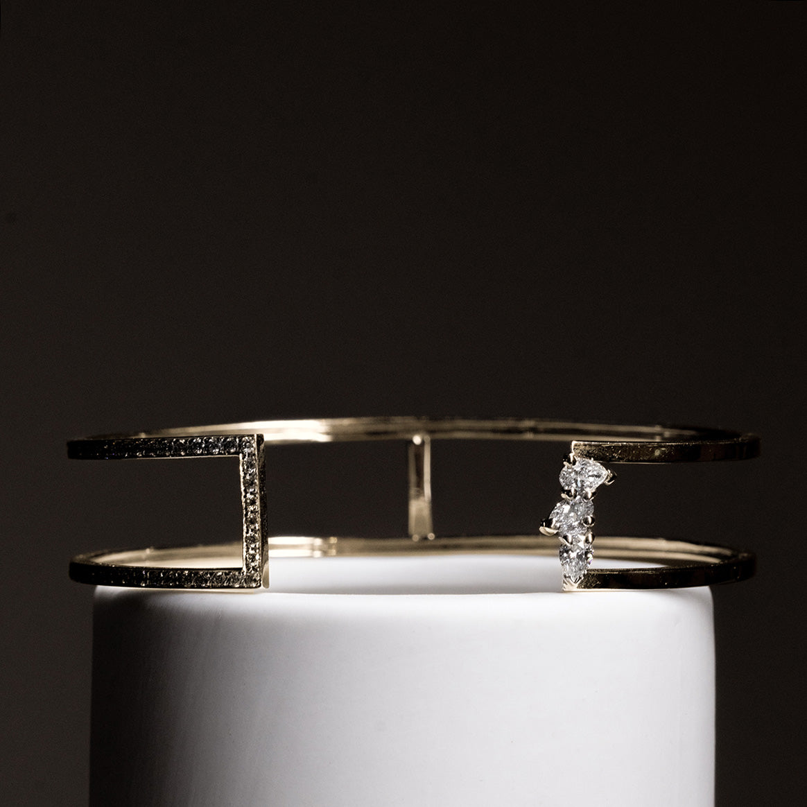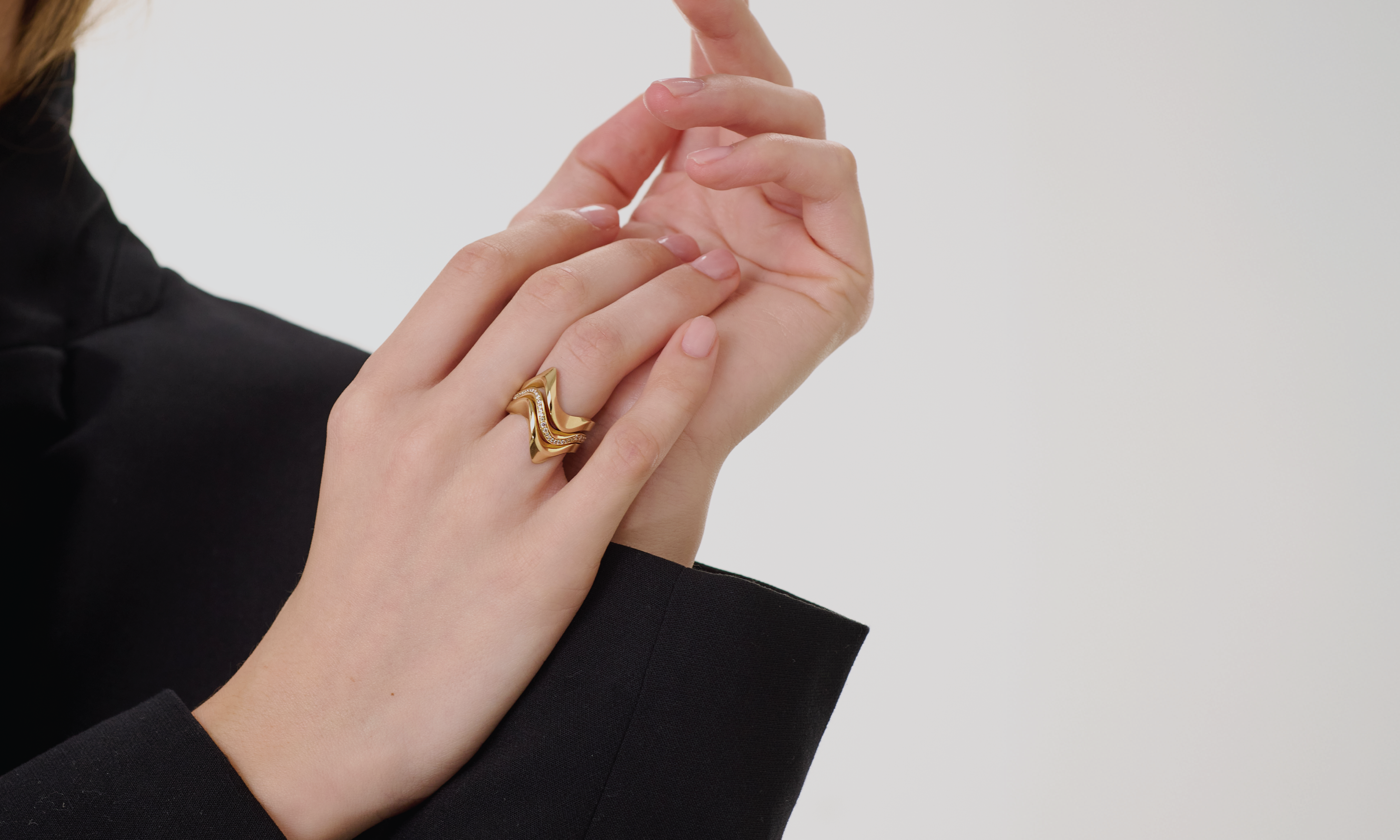 כל פריט בקולקציה מעוצב בקפידה בשילוב הרמוני של זהב ויהלומים, ובעיצובים הנראים כאילו הם נמתחים ומעוקלים כמו צורות גמישות.