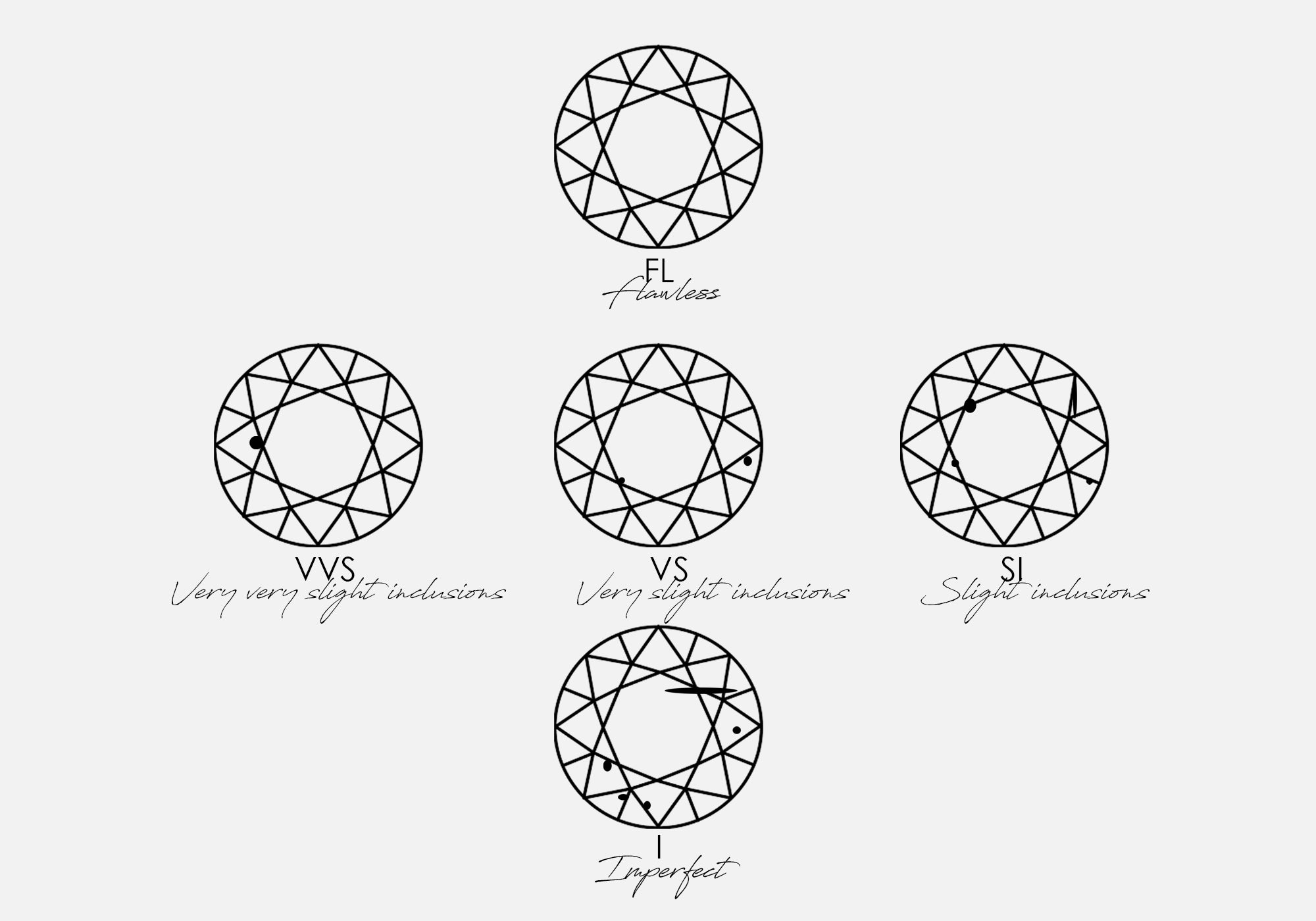 כהמלצה, אנחנו אוהבות לעבוד עם יהלומיי VS-SI כל עוד הפגמים אינם נראים לעין רגילה (ללא זכוכית מגדלת). כך למעשה אנחנו ״יורדים״ באיכות בקטגוריה אחת, אך הפשרה מאפשרת לנו לעלות באיכות בקטגוריות אחרות כמו צבע או משקל.