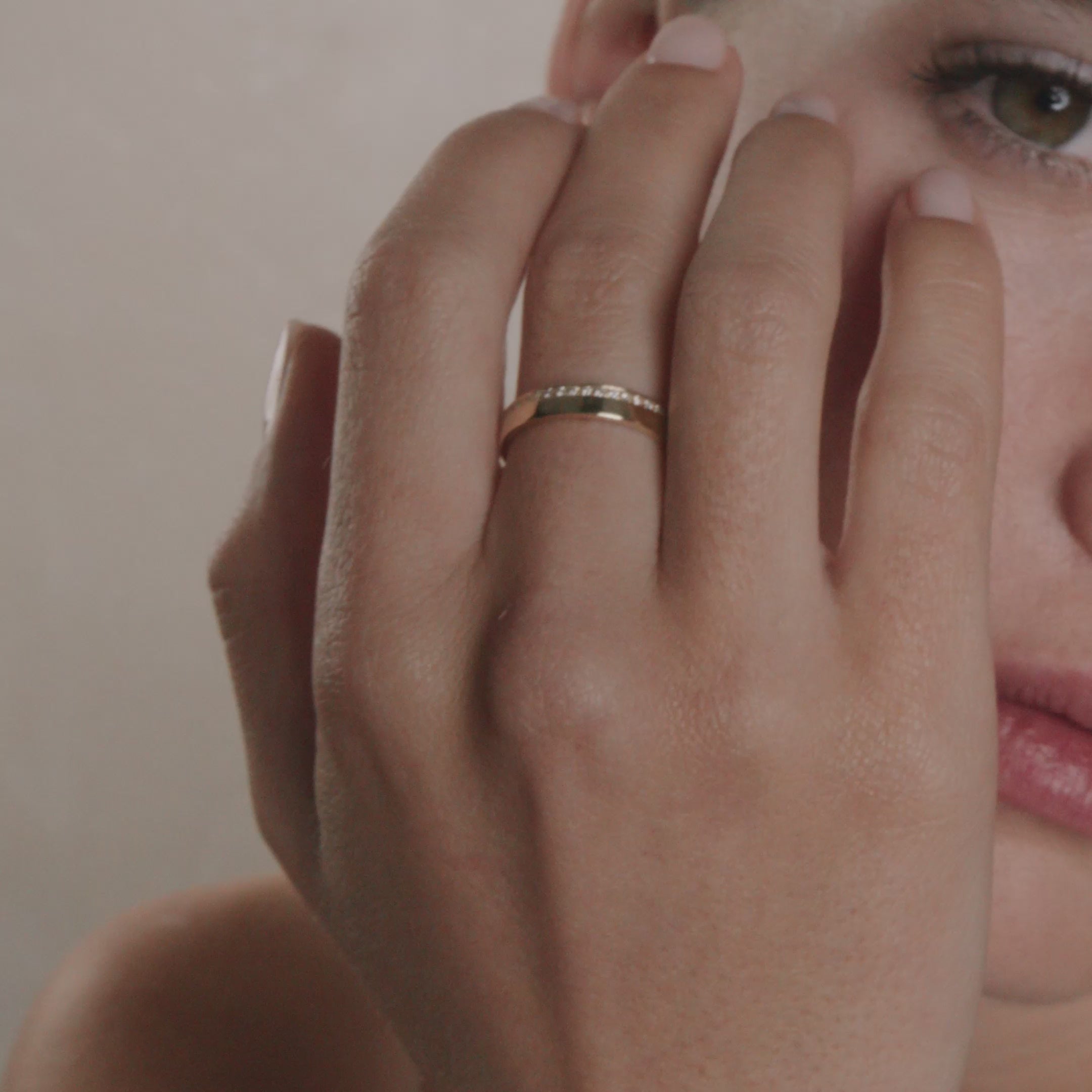 טייק מודרני לטבעת חתונה קלאסית- עם יהלומים משובצים בקו עדין סביב החצי העליון של הטבעת. תתאים מתחת לטבעת האירוסין שלך בצורה מושלמת.