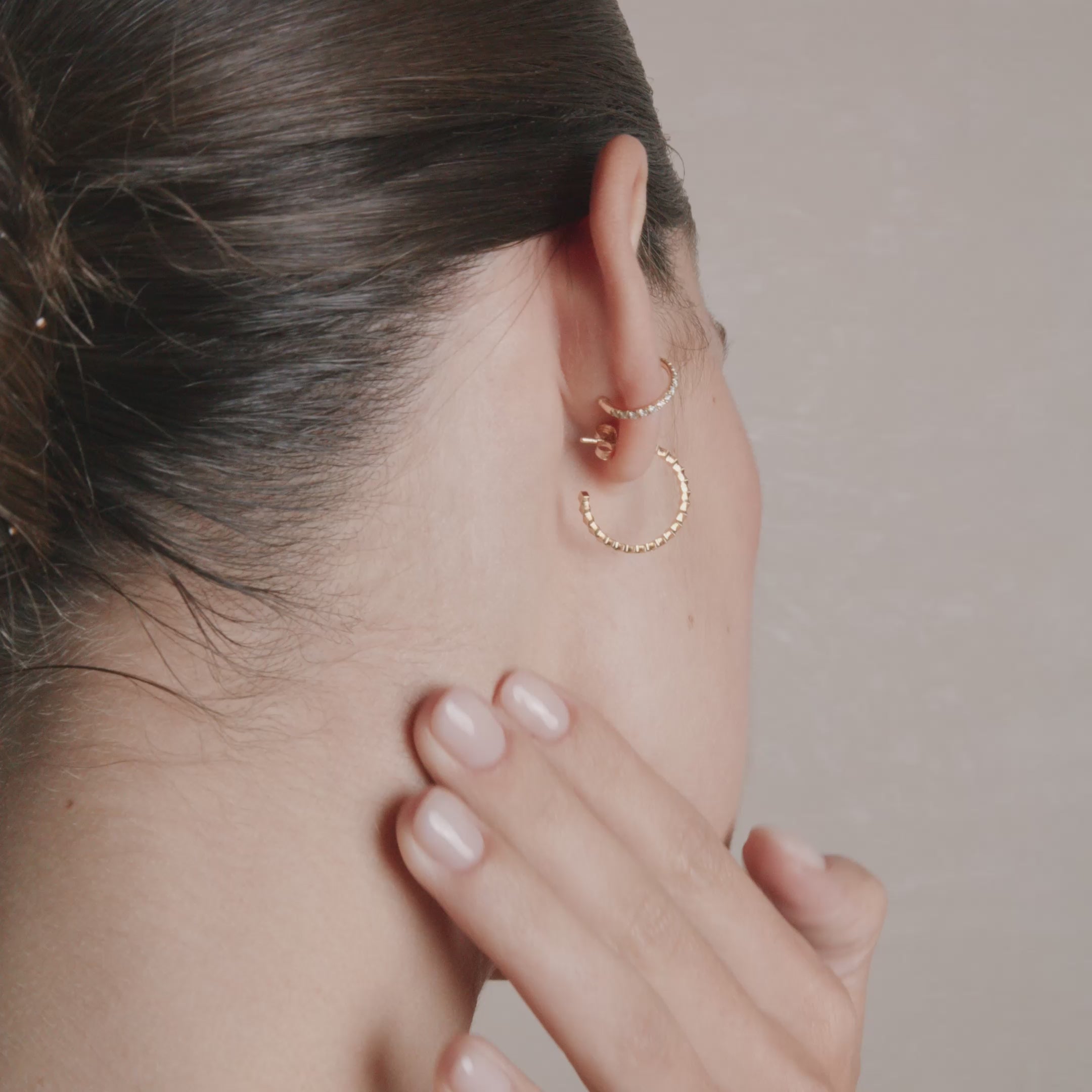 עגילי חישוק המורכבים מאלנטים מרובעים המשובצים ביהלומים עגולים קטנים. העגיל מלא נצנוץ וברק אך קוטרו עדין ויומיומי. נוח, קליל ומתאים לכל אווטיפיט.