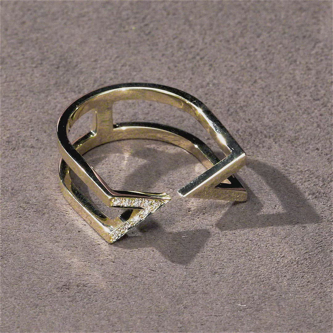 טבעת משולשת כפולה המשובצת ביהלומים עדינים וגימור זהב חלק, מהדהדת עיצוב אדריכלי.