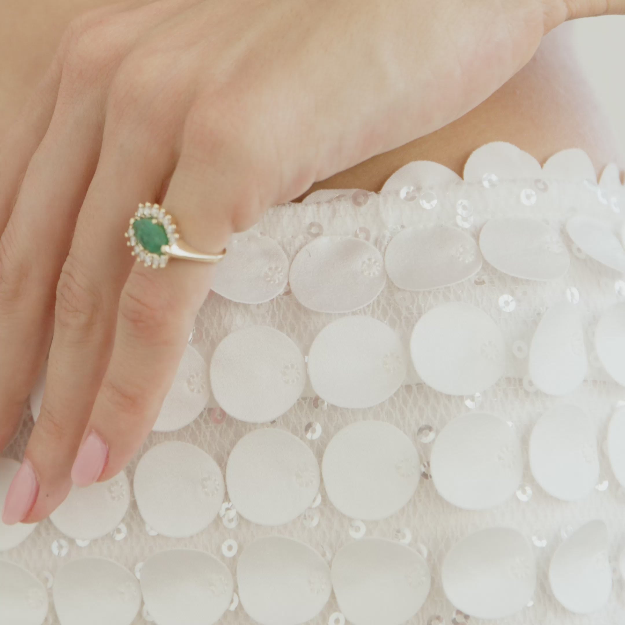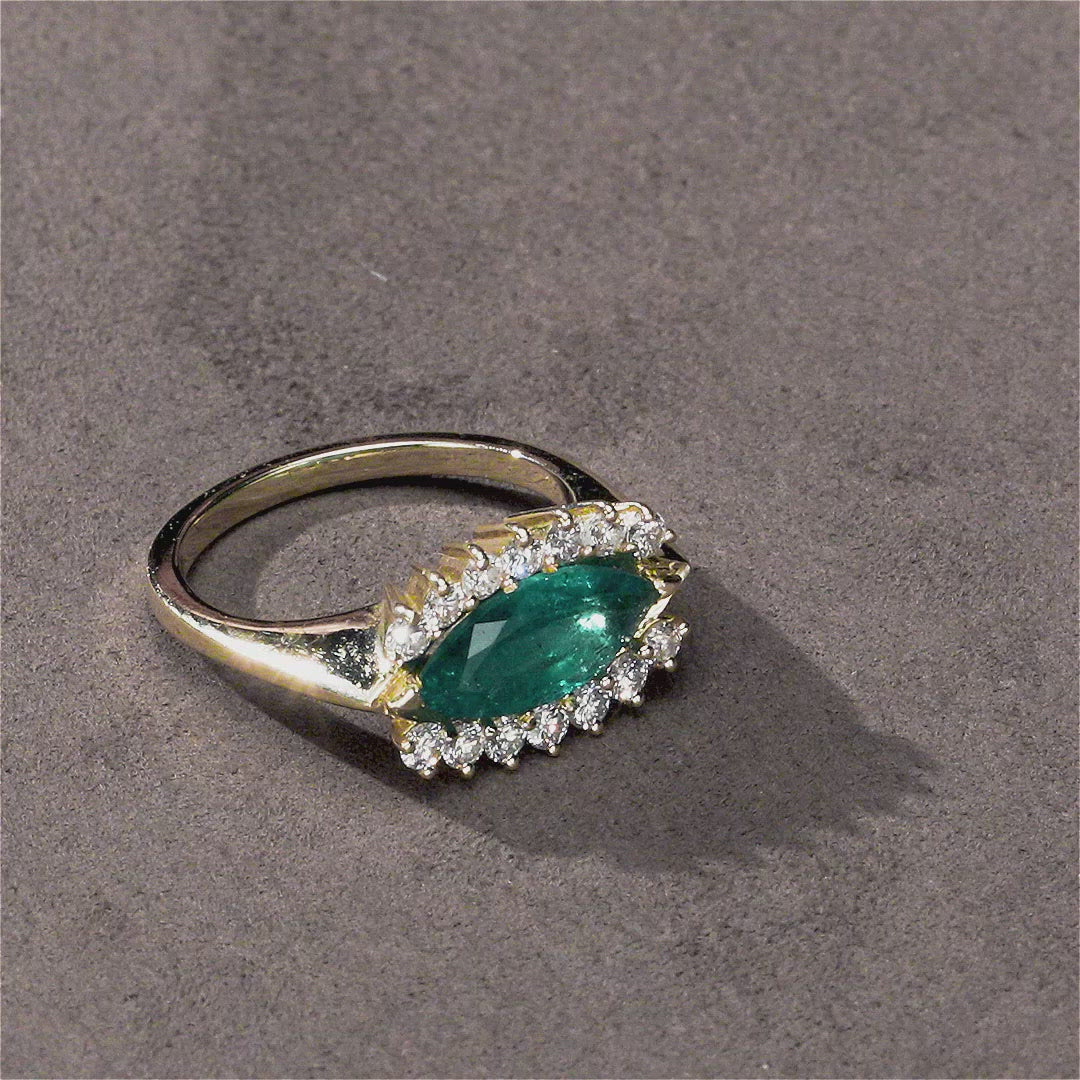 טבעת משוגעת משובצת אבן אמרלד טבעית בחיתוך מרקיזה ויהלומים עגולים משובצים מסביבה. טבעת עין עם הרבה נוכחות. ממליצות לענוד על הזרת או הקמיצה. לתשומת ליבך - האבן תבחר בקפידה עבור הזמנתך, כך שהאבן תראה מעט שונה מבתמונה. אבן האמרלד הינה אבן לא צלולה, עם מעט לכלוכים באופן טבעי - זה חלק מהיופי בה.