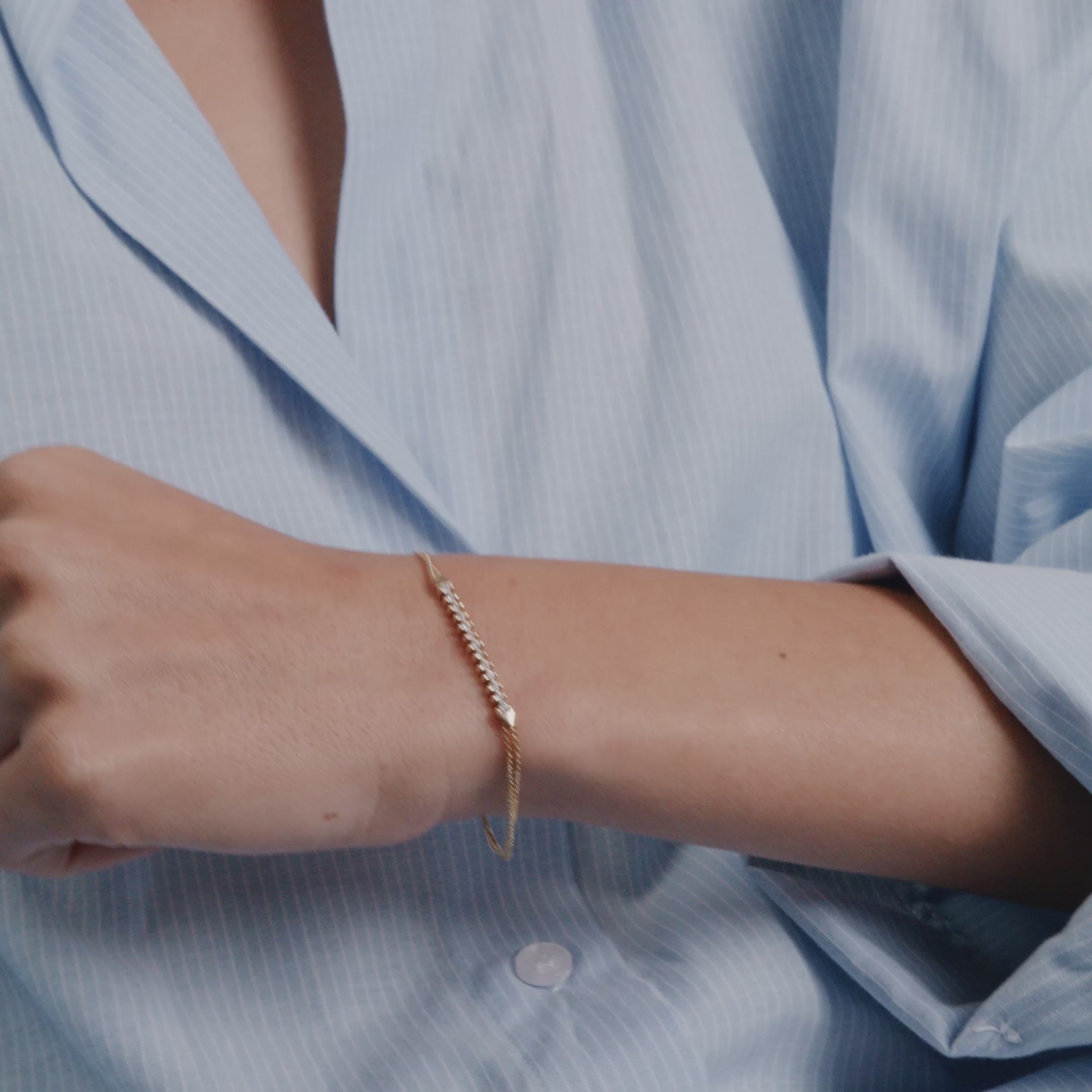 בקצה האלמנט, השרשראות מושחלות דרך דיטייל משולש גיאומטרי, המעניק ייחודיות ובידול למראה הכללי של הצמיד.