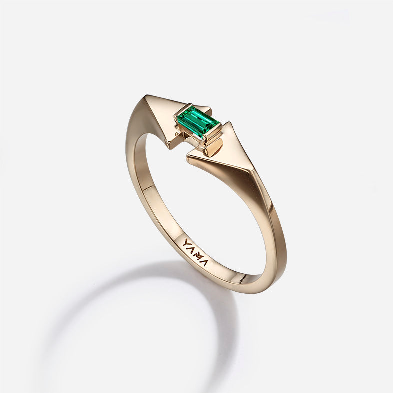 טבעת בצורת מעוין משובצת אבן אמרלד בחיתוך באגט. ממליצות לענוד טבעת זו יחד עם טבעת בצורת V.