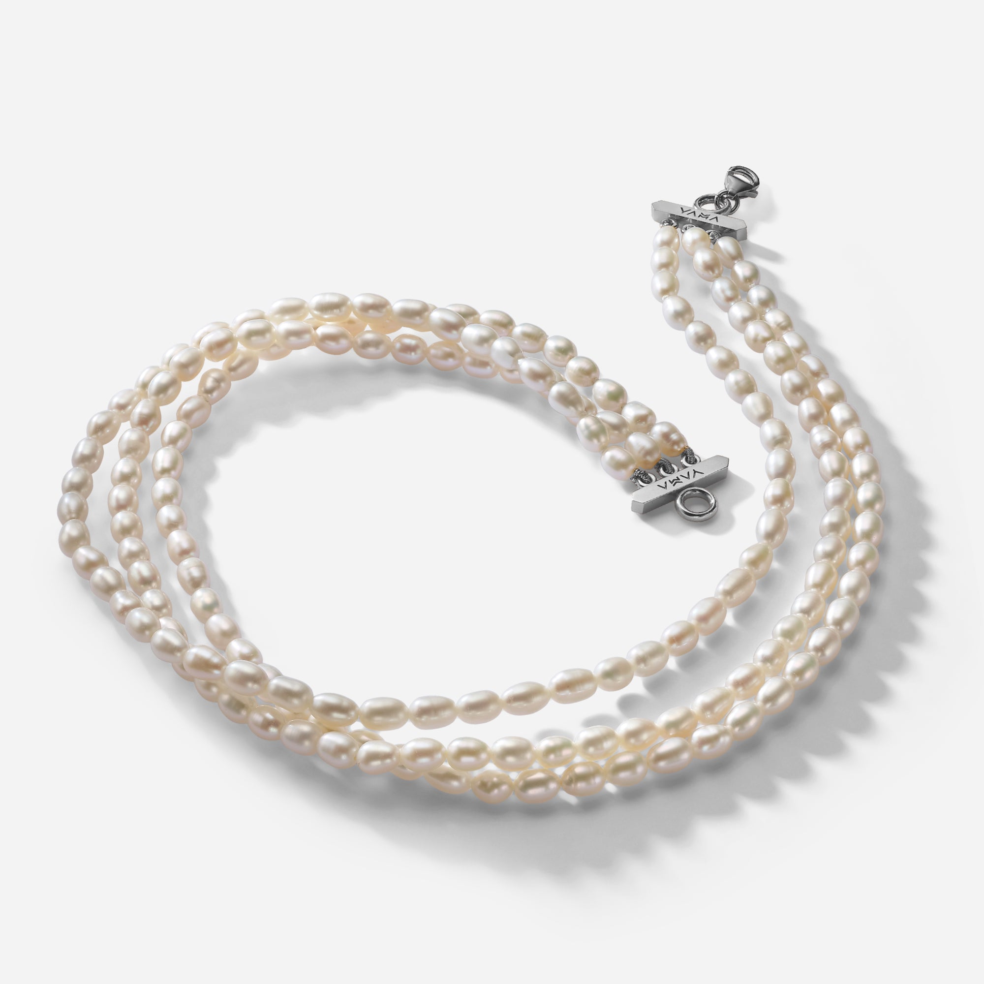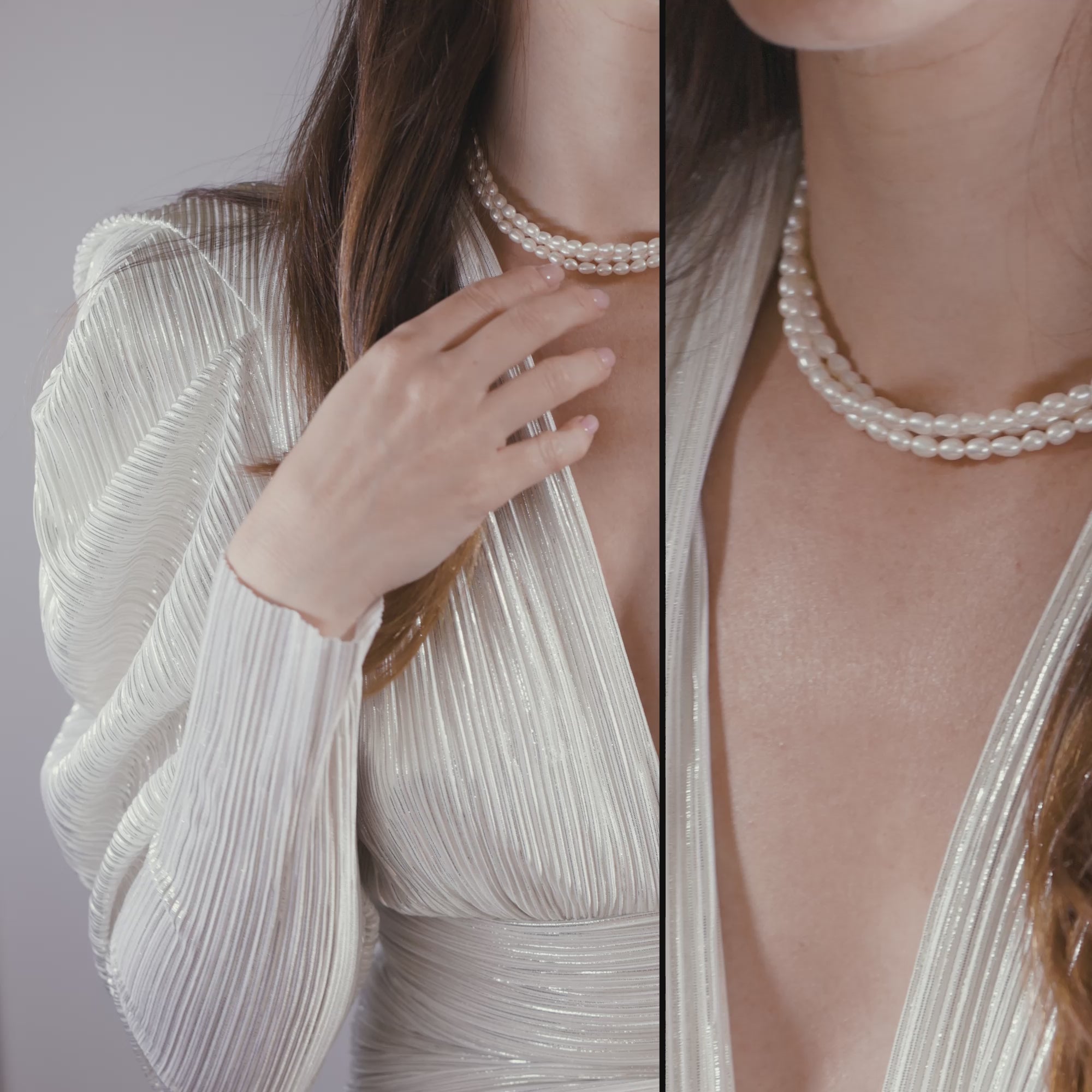 שלישיית שורות פנינים חלקלקות ומבריקות, המוגנות בקצה למנעול זהב השומר עליהם מופרדות על הצוואר ומרווחות במידה המדוייקת.