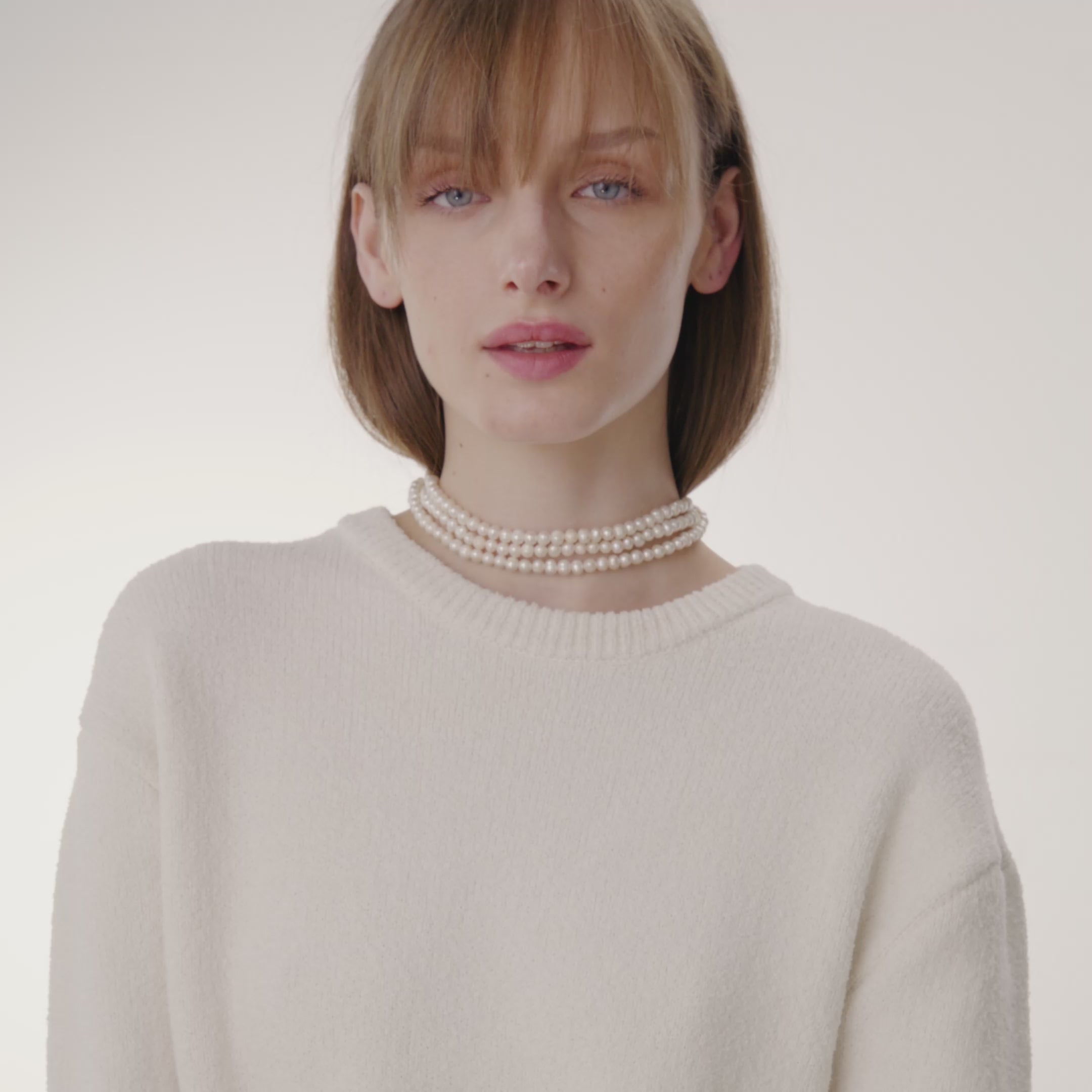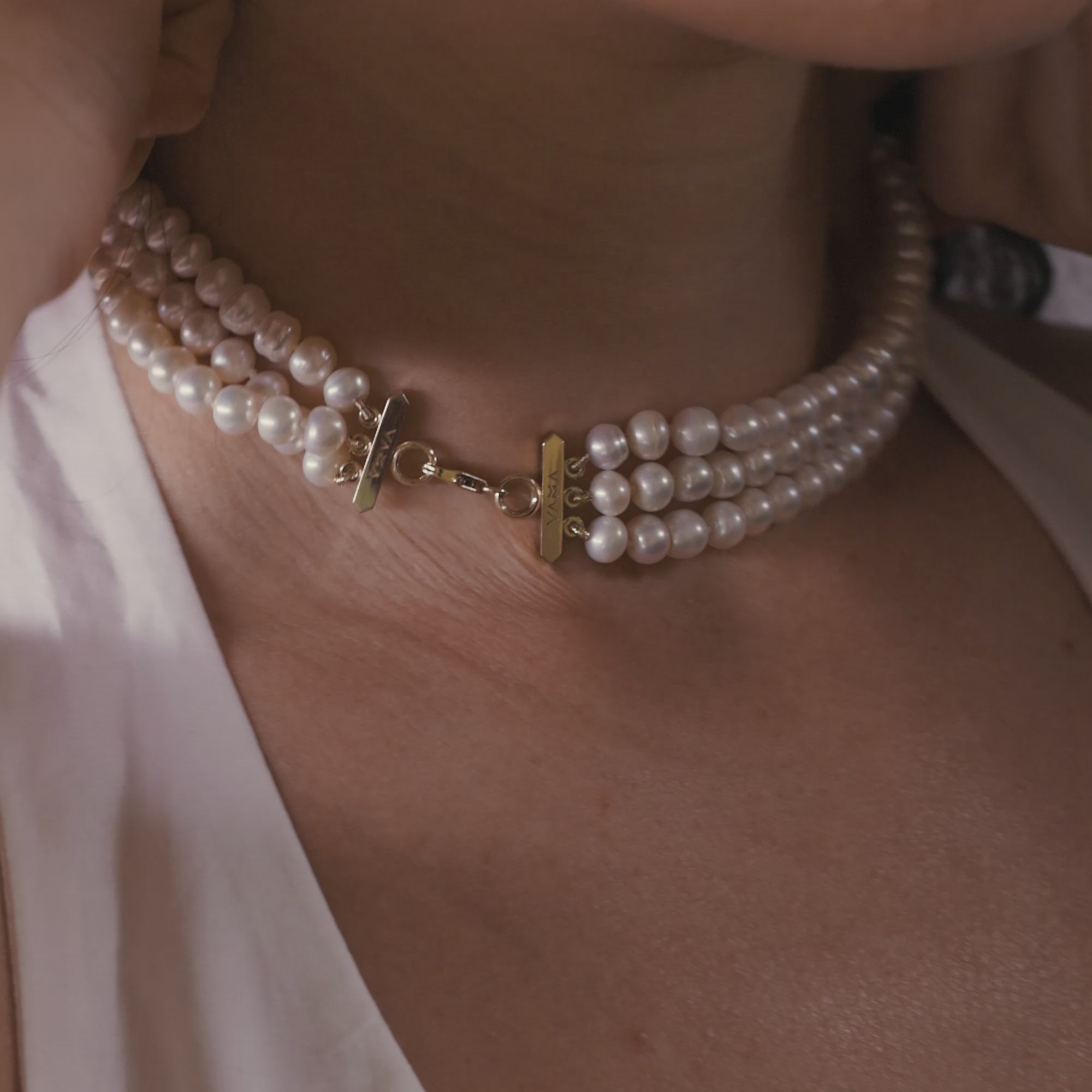 שלישיית שורות פנינים עגולות ומבריקות, מעוגנות בקצה למנעול זהב ששומר עליהן מופרדות על הצוואר ומרווחות כדי לייצר שרשרת מרשימה ומדוייקת.