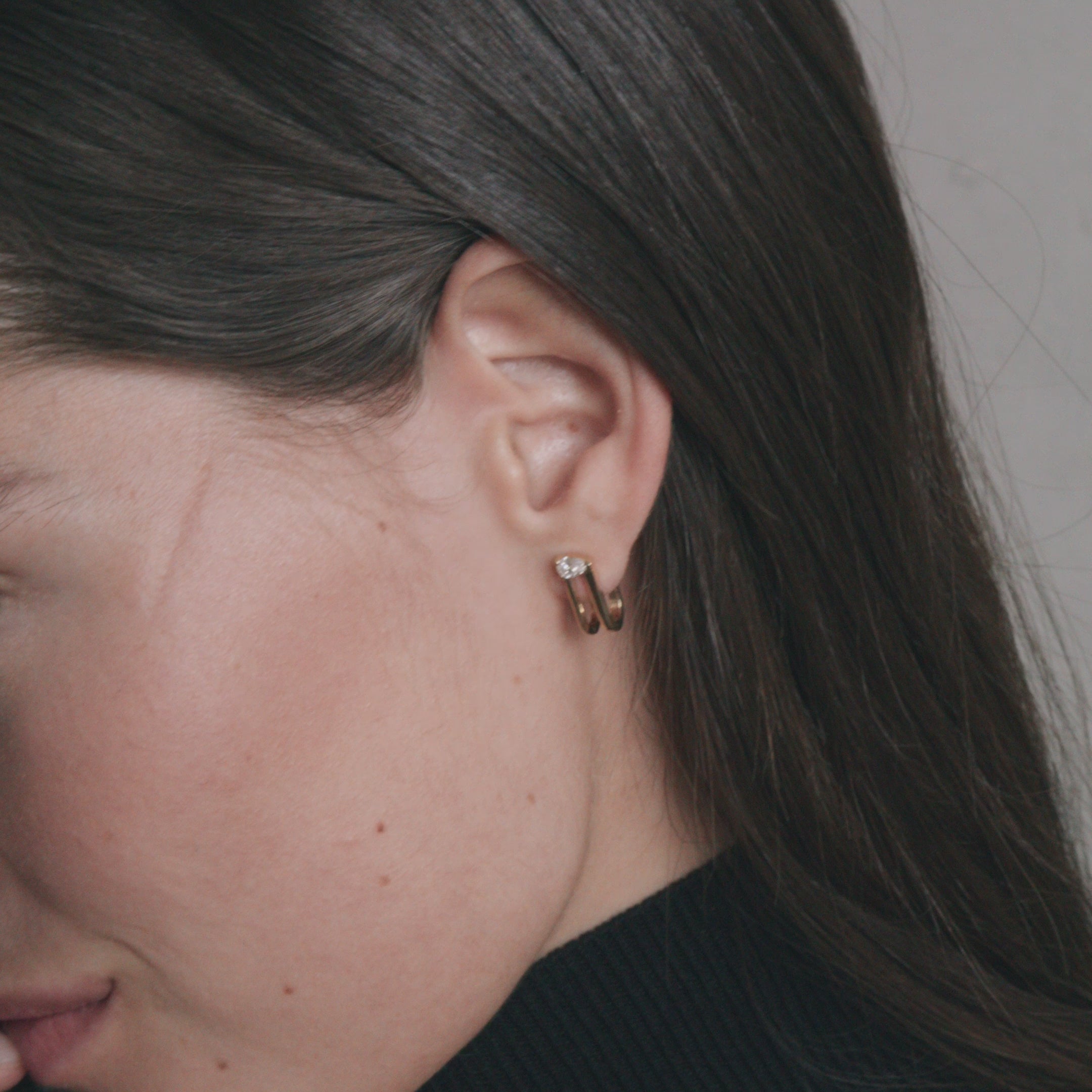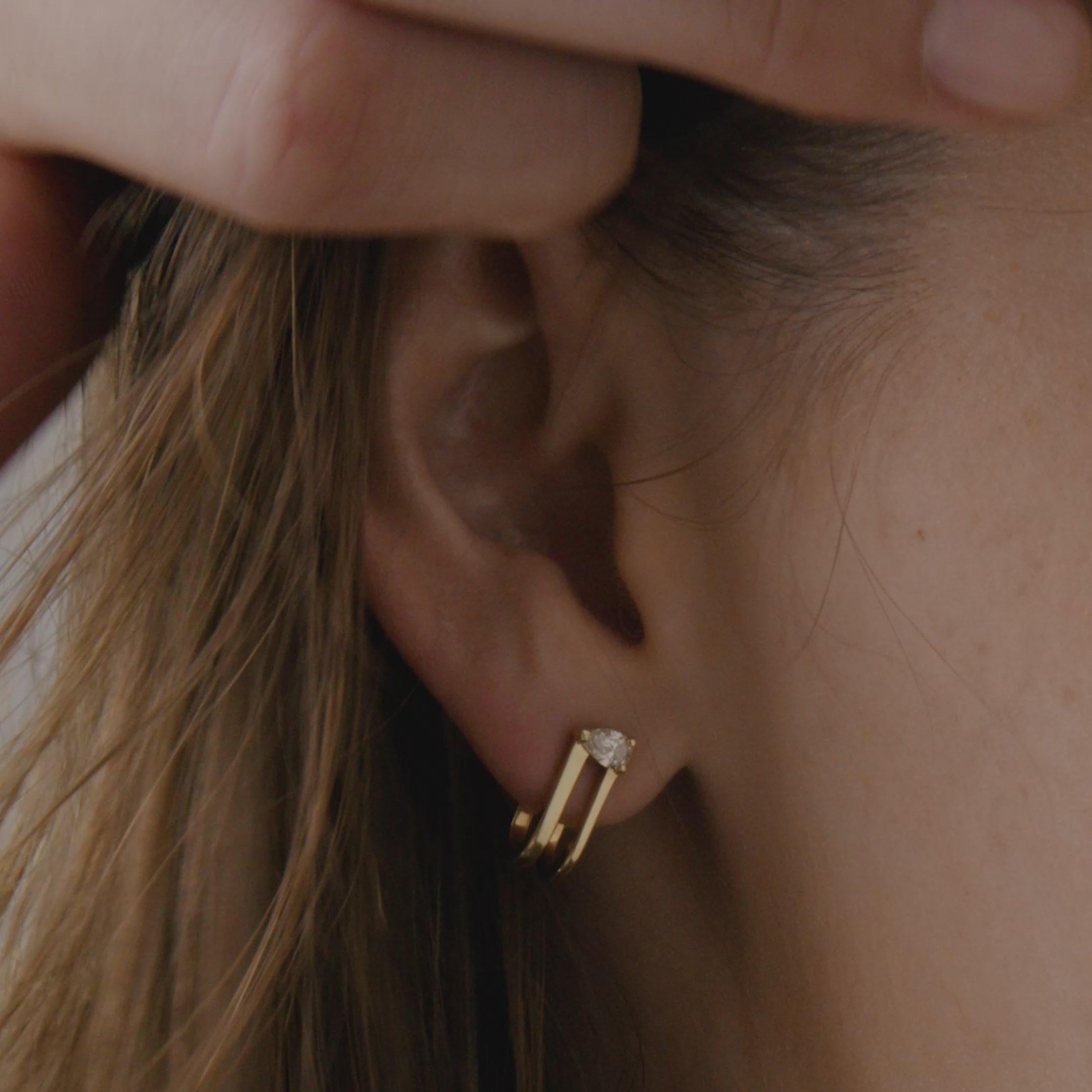 עגילי חישוק קטנים, שעוטפים את התנוך בצורה עשירה ומלאה. שני המוטות המעוגלים שמחזיקים את יהלום הטיפה הינם ברוחב שונה, כך שנוצר סביב התנוך מראה מלא ומעניין.