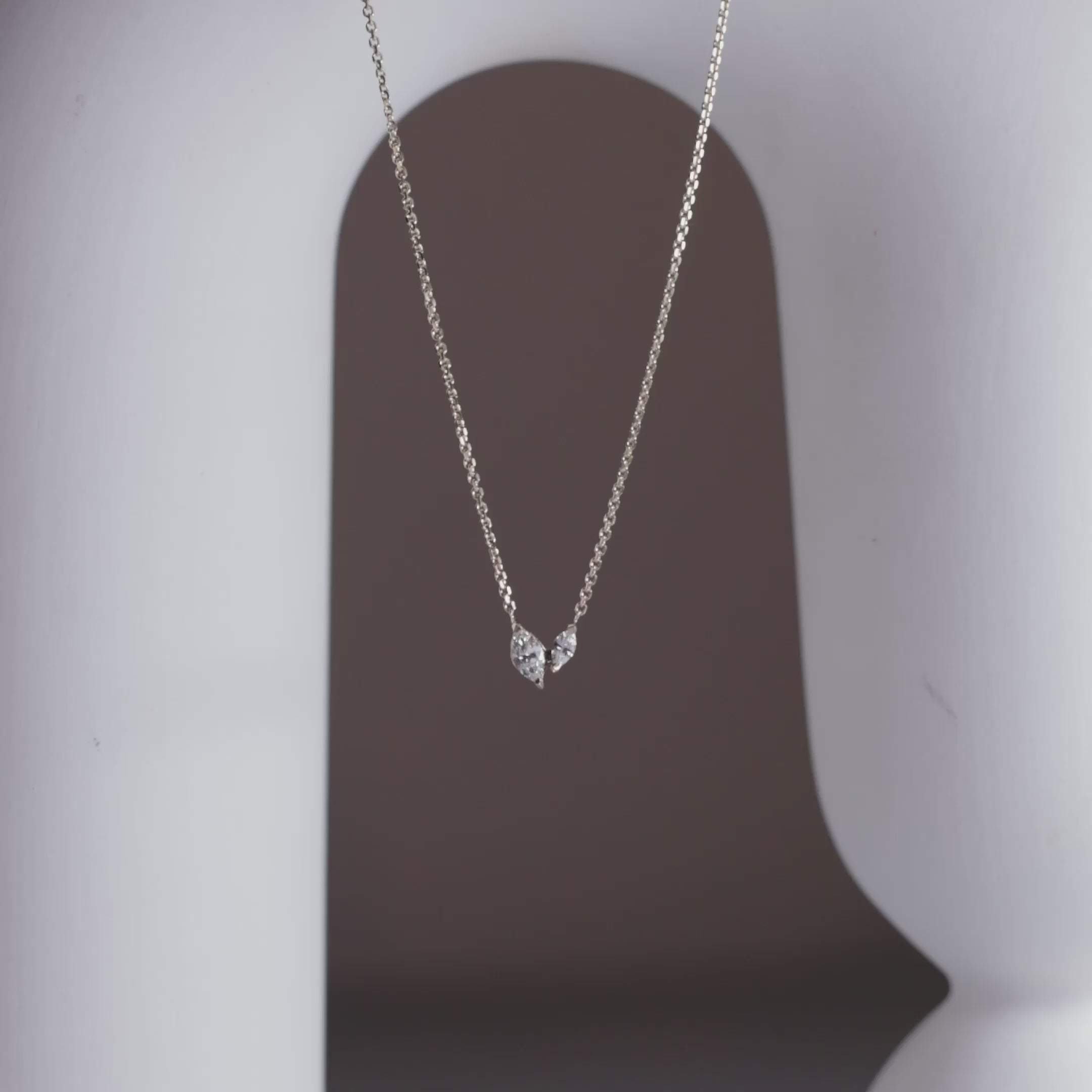 שרשרת עדינה ויוקרתית המורכבת מזוג יהלומי מרקיזה בגדלים משתנים, משובצים בצורה מרחפת על גבי שרשרת עדינה.