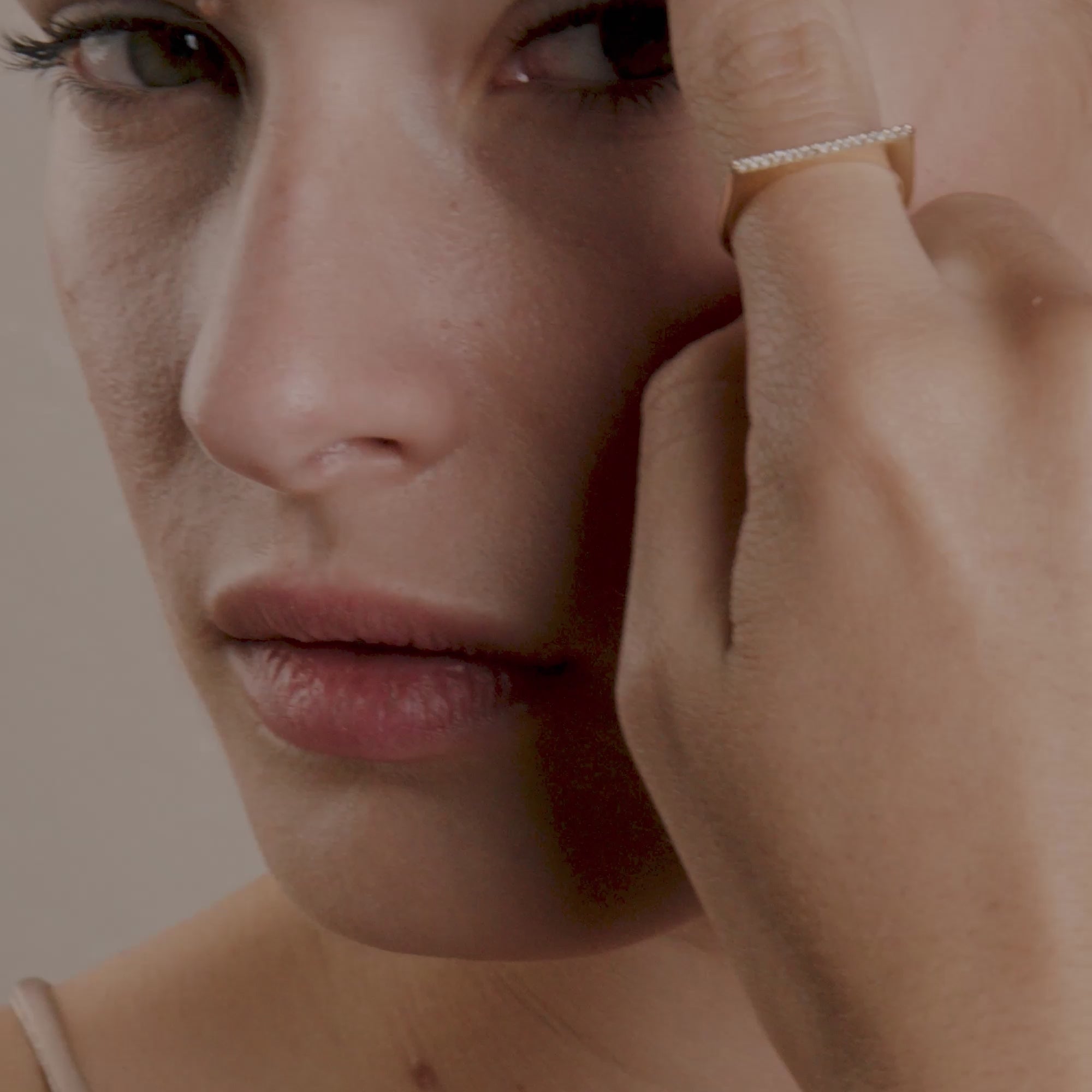 טבעת קלאסית אך אדג׳ית בעלת יהלומי פאווה המשובצים על רצועת הזהב. ניתן לערום בקלות וכיף לענוד אותה עם טבעות אחרות.