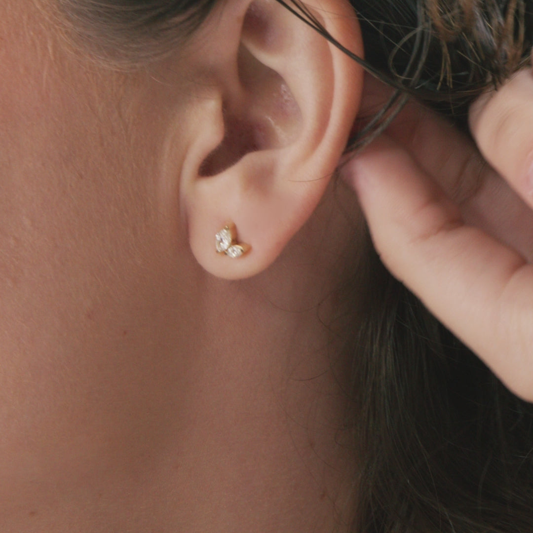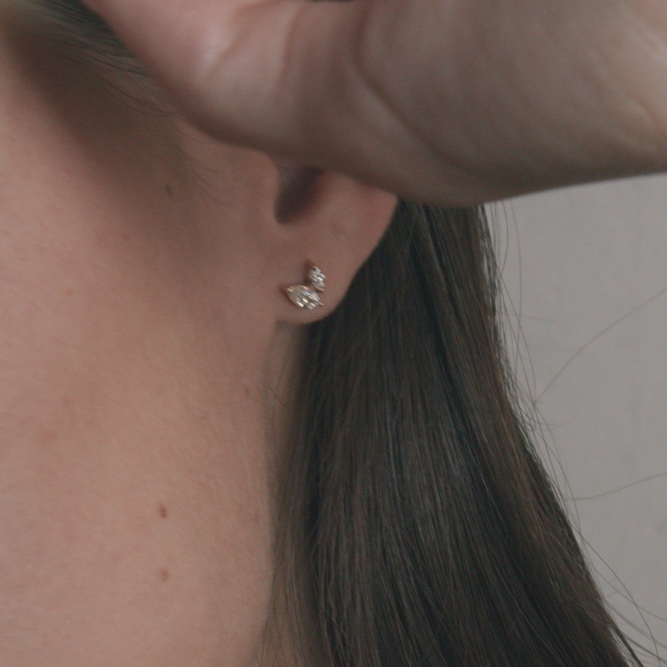 עגילי יהלום צמודים משובצים יהלומים בצורת מרקיזה זה לצד זה.