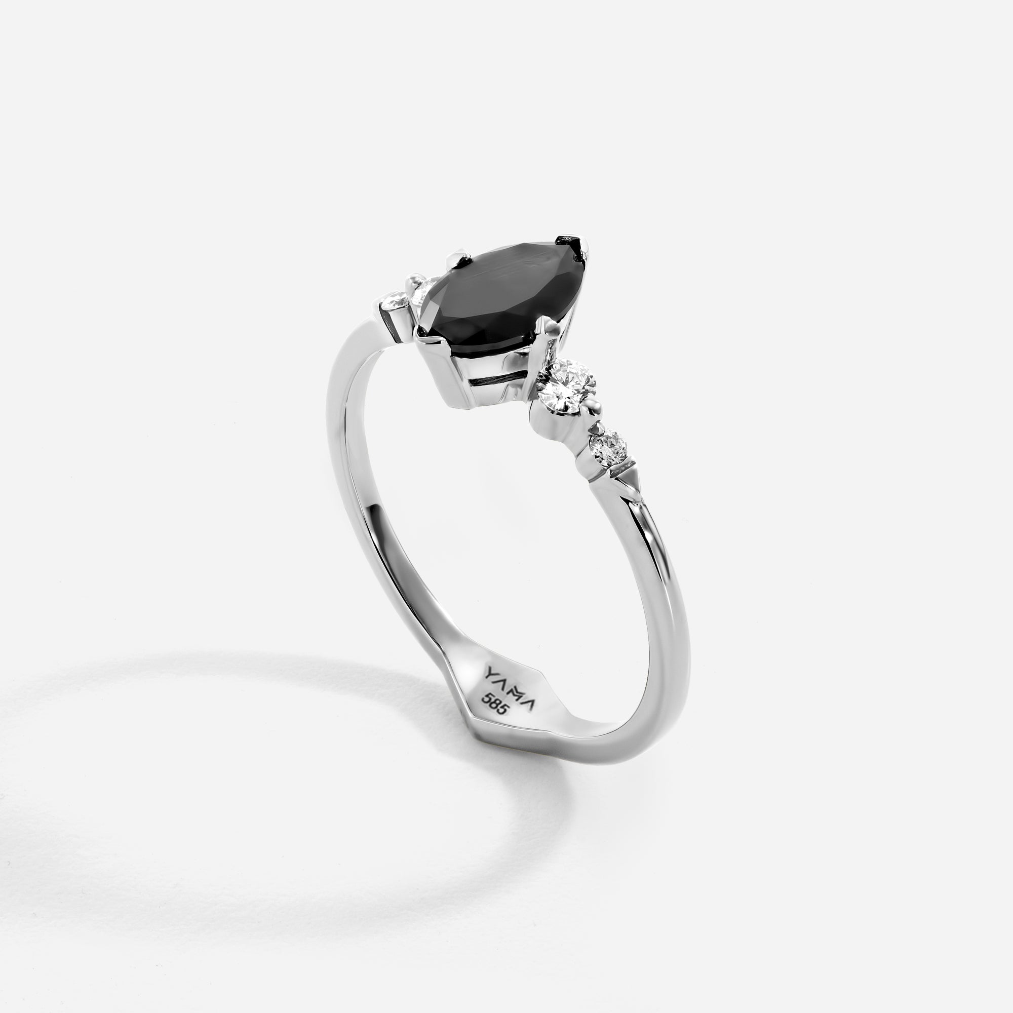 טבעת סטייטמנט משובצת ביהלום שחור בחיתוך מרקיזה ויהלומי צד במשקל 0.15 קראט.
