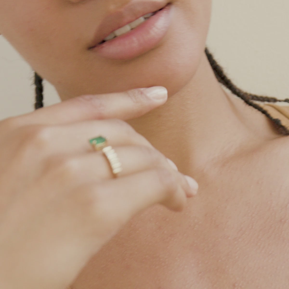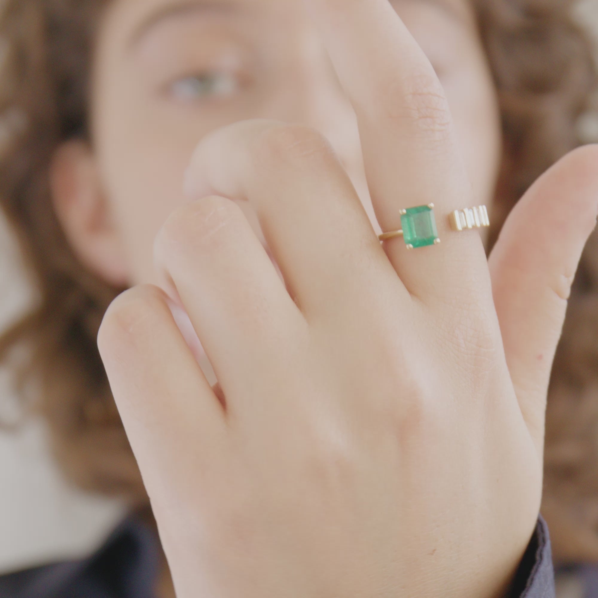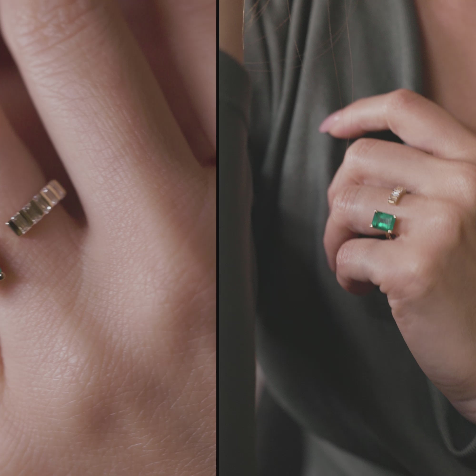 טבעת משובצת באבן חן אמרלד, בחיתוך אמרלד ויהלומי בגט צדדיים, הטבעת הזו תהיה הפייבוריטית החדשה שלך. כל אבן נבחרת לפי הזמנה, ויש לה פרופורציות ומשקל משלה - לכן עשויה להיראות מעט שונה מהתמונה.