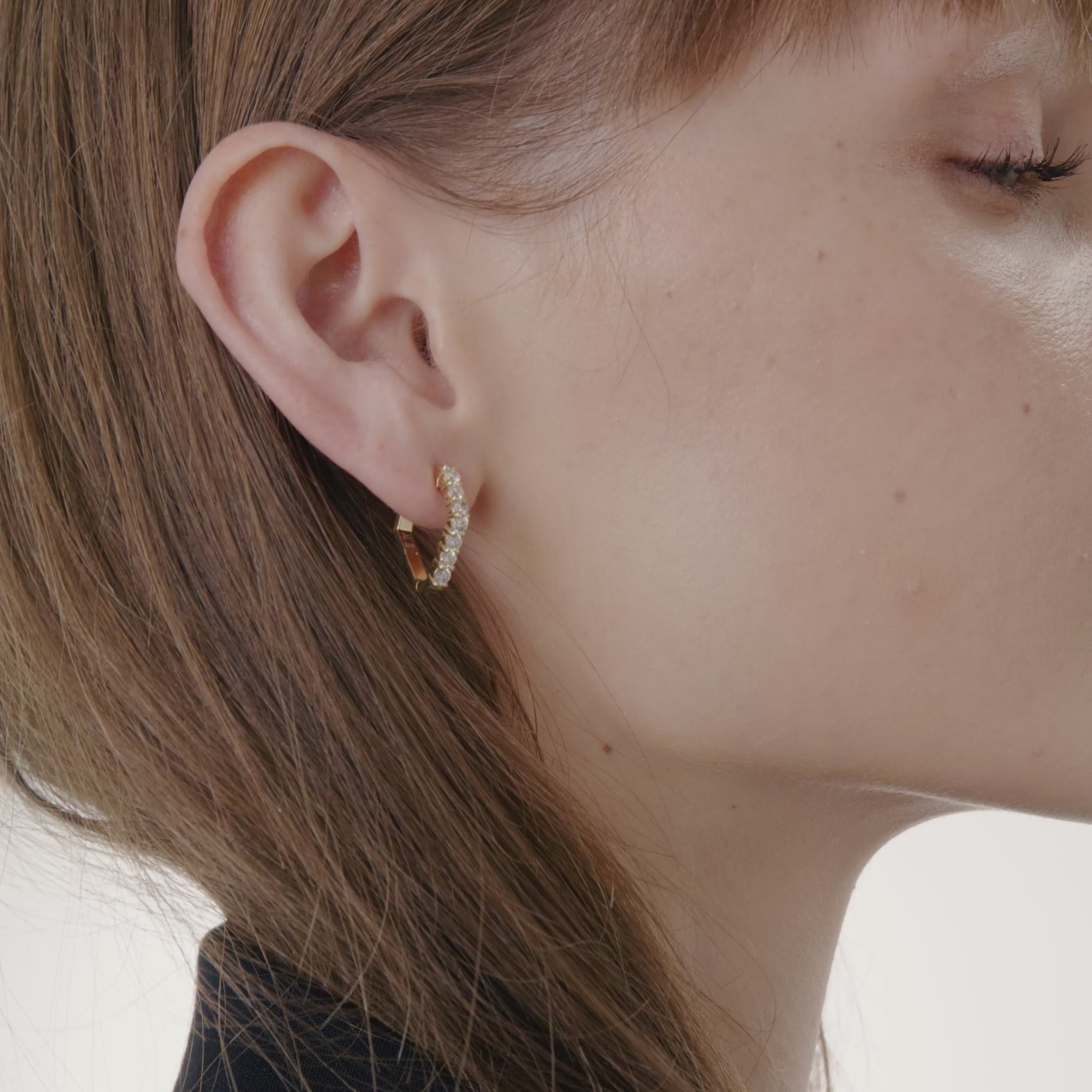 זוג עגילי חישוק קטנים וצמודים בצורת מתומן משובצים יהלומים נוצצים.