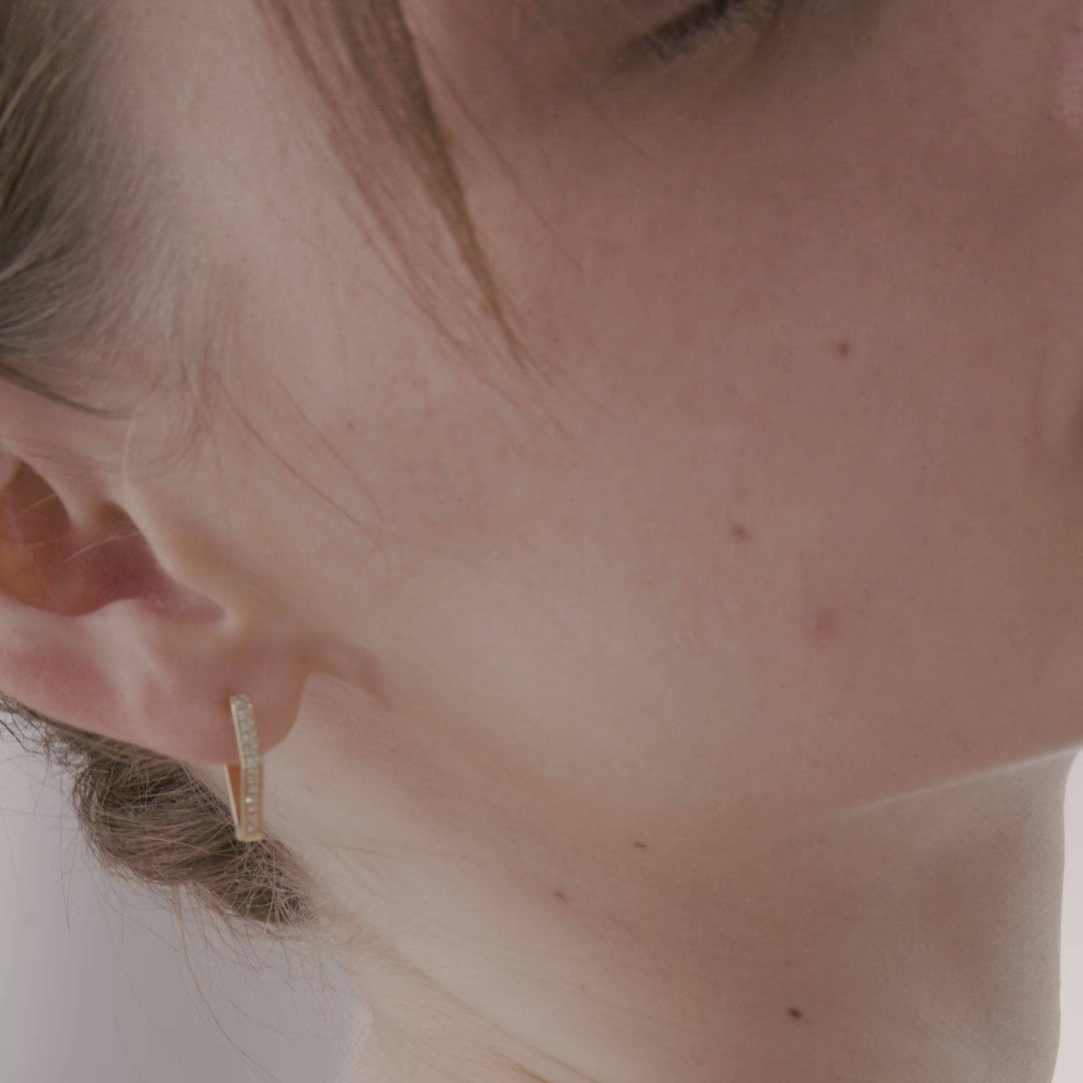 זוג עגילי חישוק קטנים וצמודים בצורת מתומן משובצים יהלומים עדינים ונוצצים.