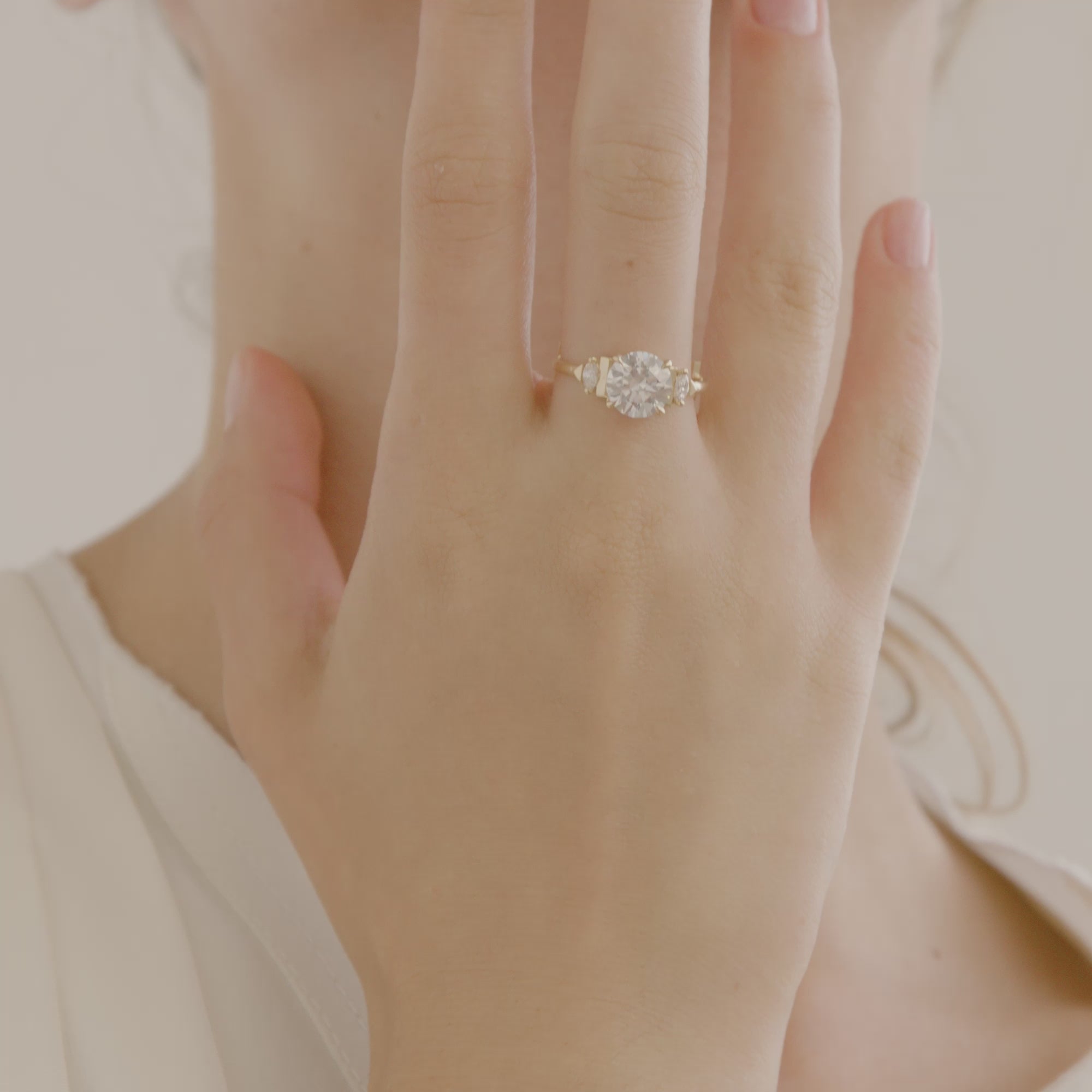 טבעת אירוסין מרשימה במיוחד, המורכבת משלישיית יהלומים בחיתוך עגול ומרקיזות בפרופורציות מושלמות היושבות זו לצד זו.