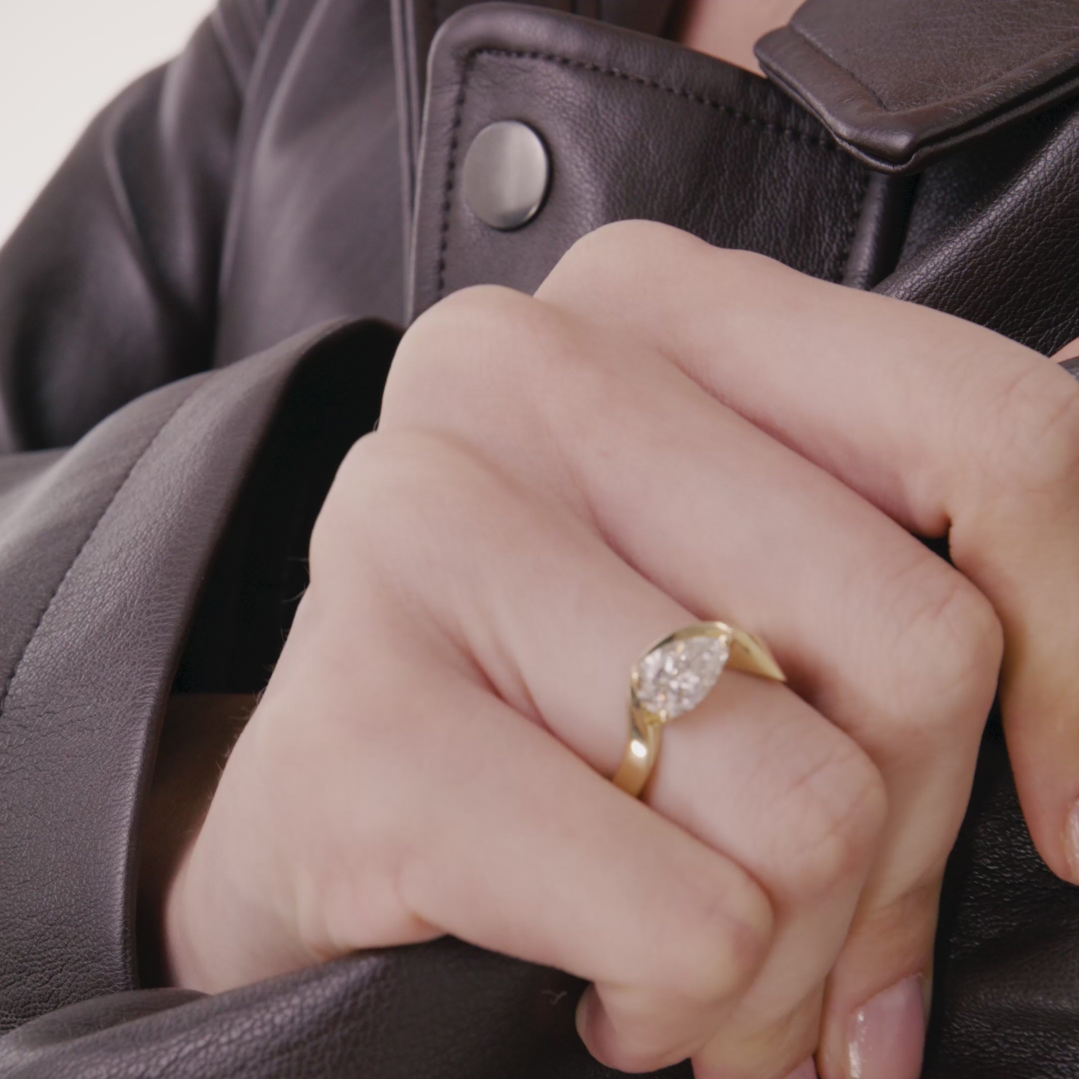 טוויסט לטבעת האירוסין הקלאסית: טבעת יוצאת דופן במראה מעוגל משובצת יהלום טיפה, ומתחברת בצורה מושלמת, מעל או מתחת לכל טבעת אחרת מהקולקציה.