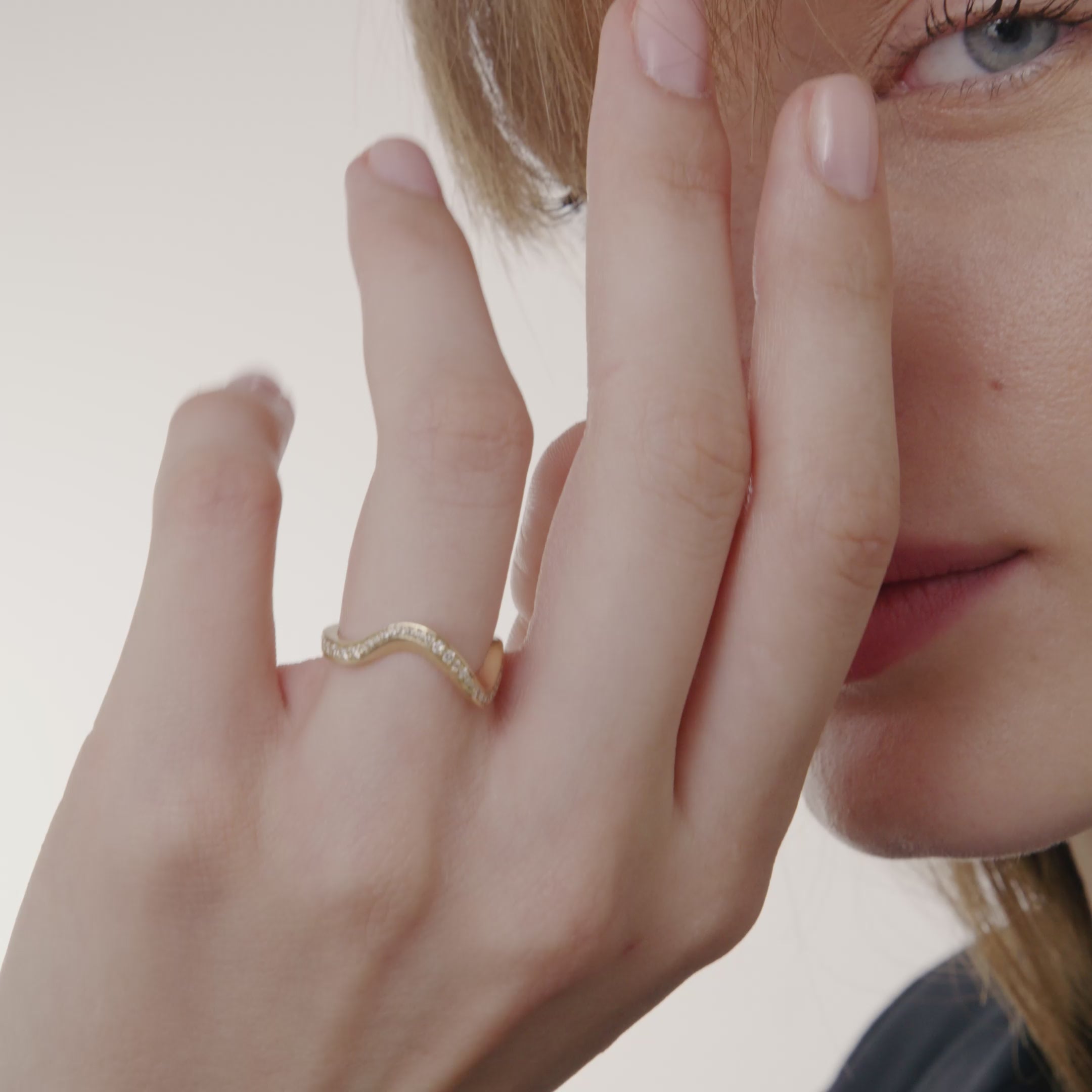 טבעת בקווים עגולים ומראה מודרני ונקי משובצת יהלומים עדינים, ומתחברת בצורה מושלמת, מעל או מתחת לכל טבעת אחרת מהקולקציה.
