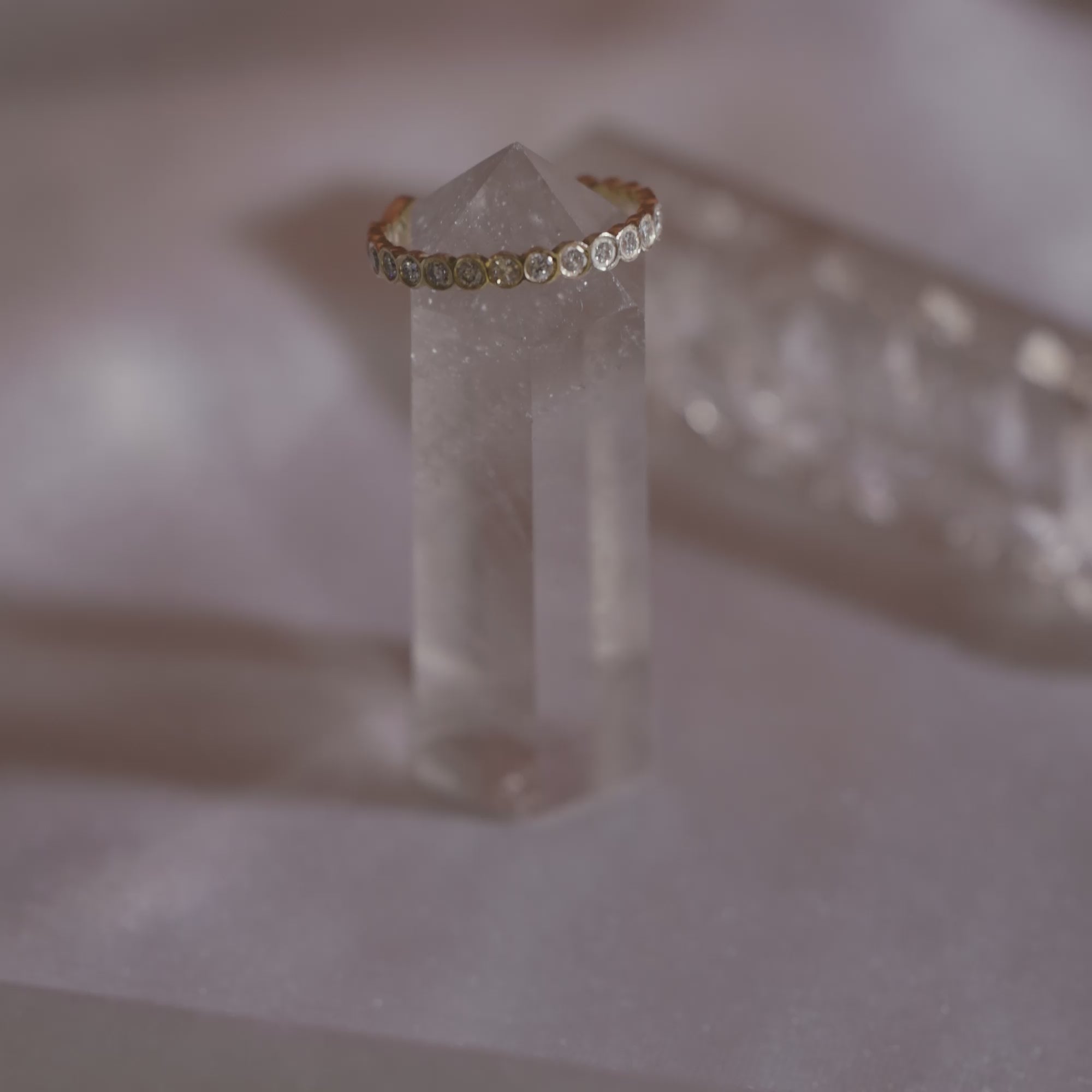 טבעת יהלומים מבריקים ועגולים משובצים בכוסות עדינות מזהב.