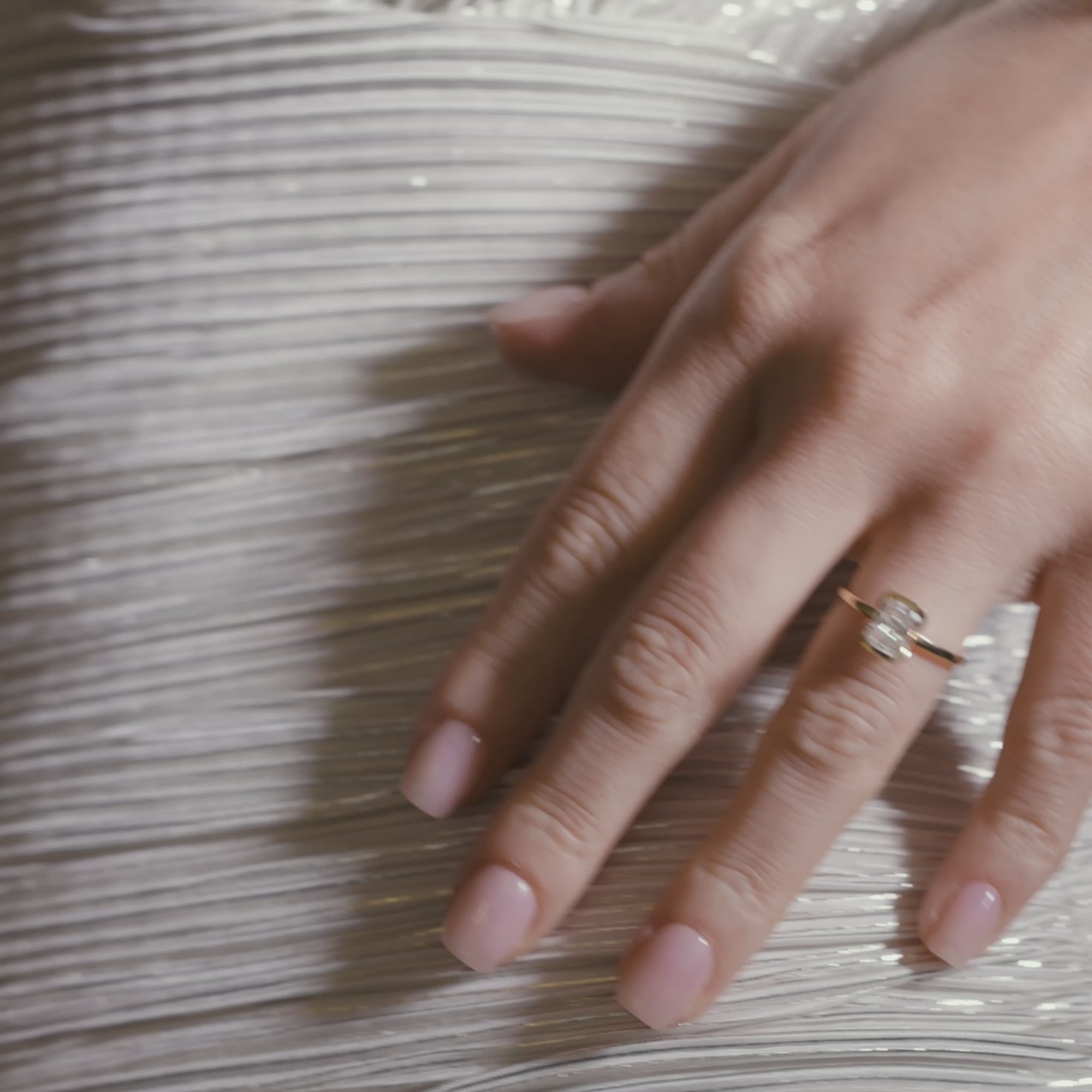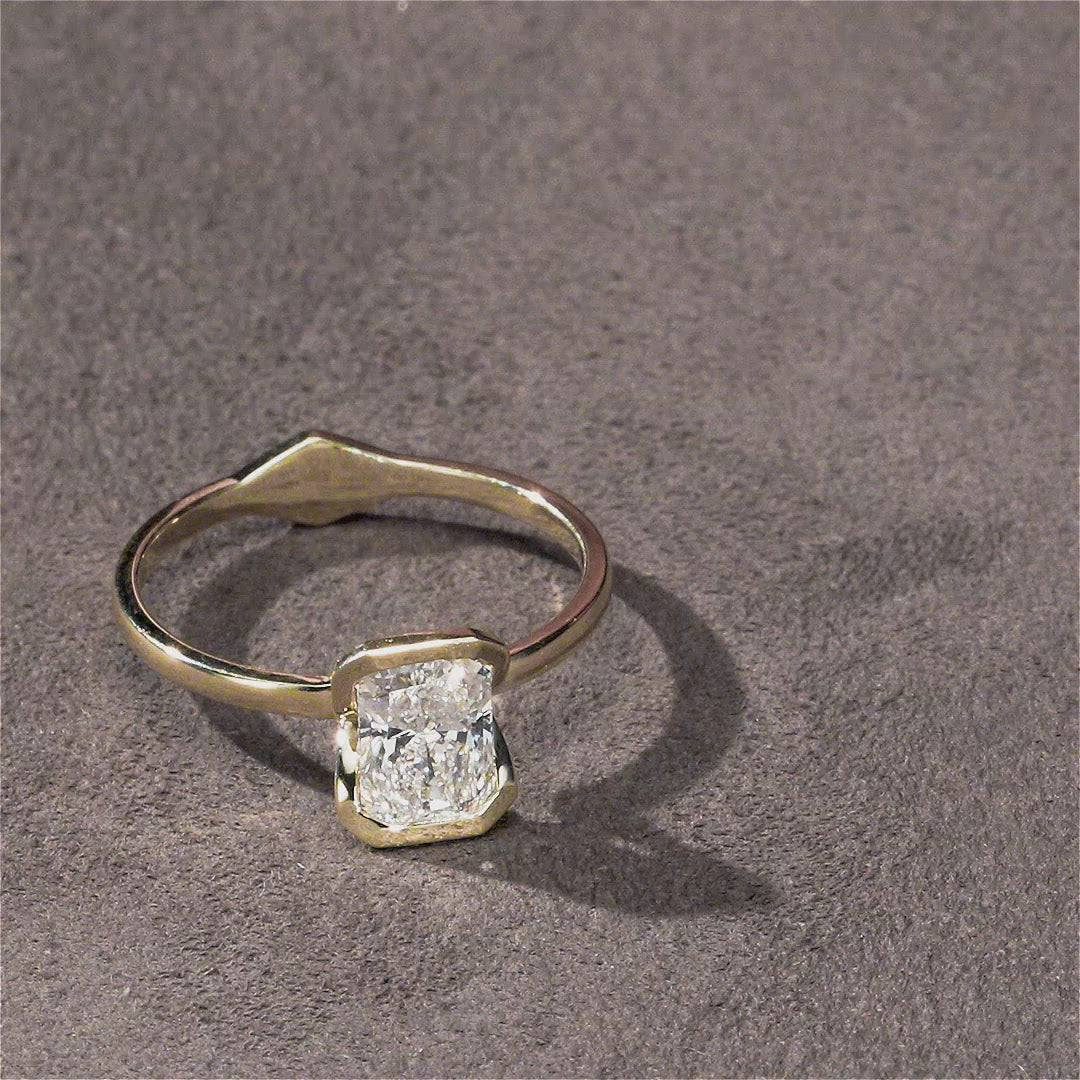 טבעת אירוסין מדהימה, המורכבת מיהלום מרכזי בודד בחיתוך רדיאן ושיבוץ ייחודי מאוד.