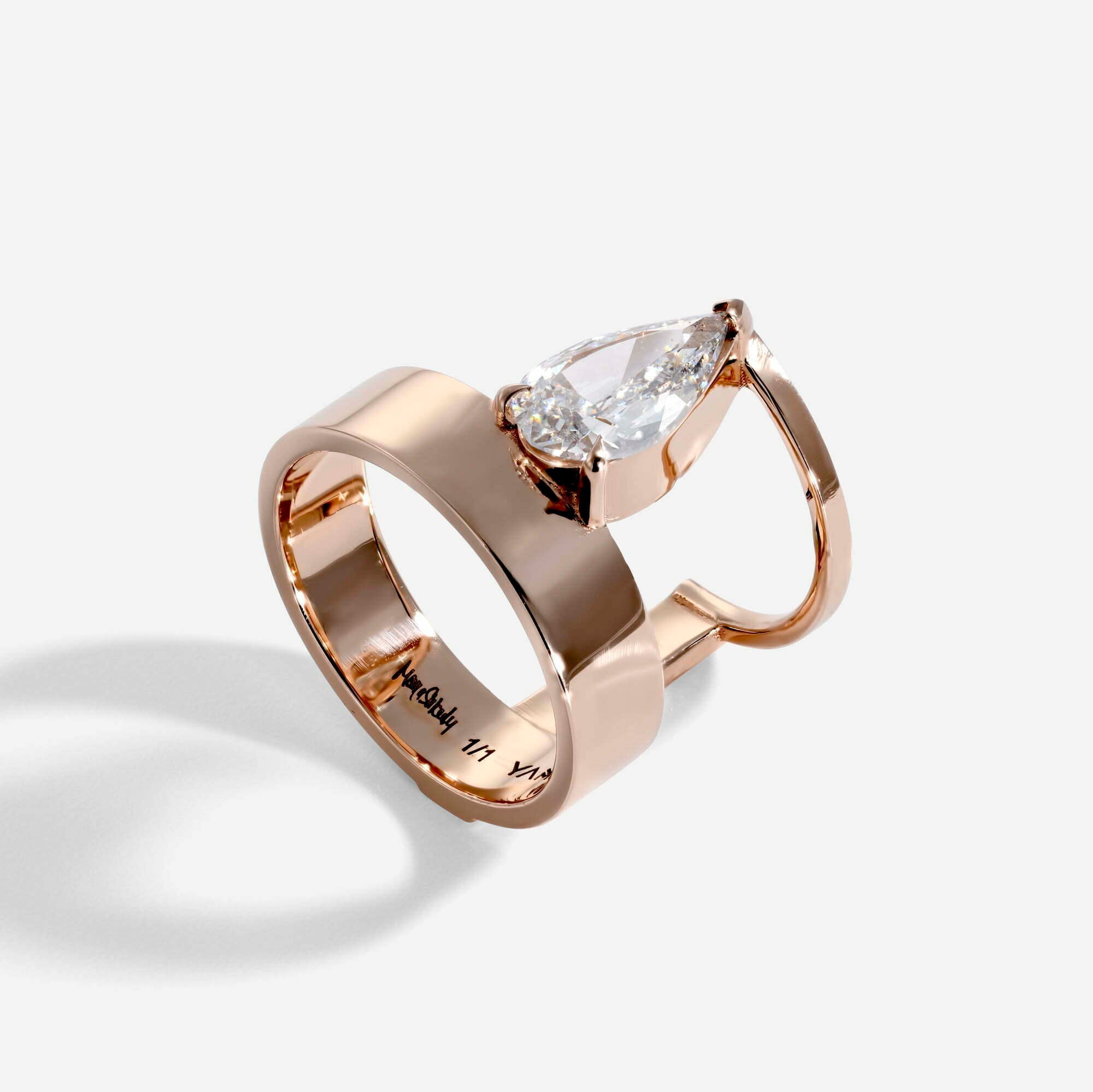 טבעת א-סימטרית בעיצוב מיוחד במינו , משובצת יהלום טיפה.
