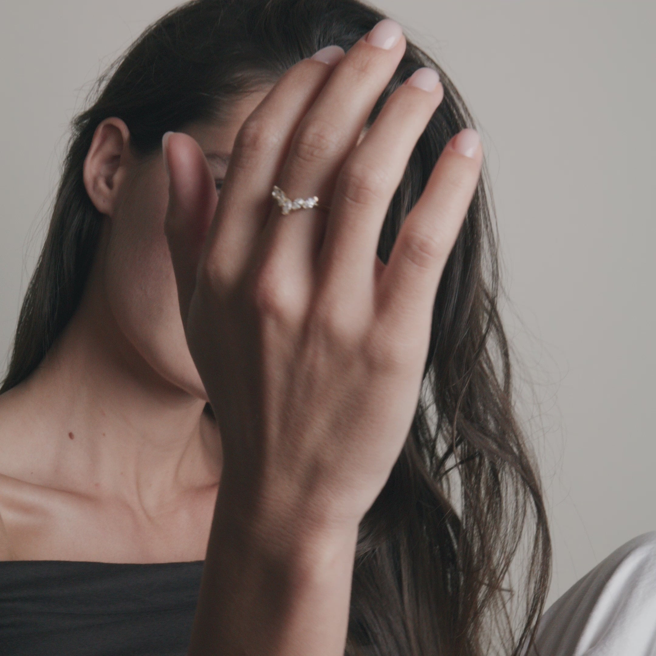 טבעת וי בשיבוץ יהלומי מרקיזה. מושלמת לענידה בקמיצה, או מתחת לטבעת אירוסין. טבעת עם נוכחות יפה ונוצצת.