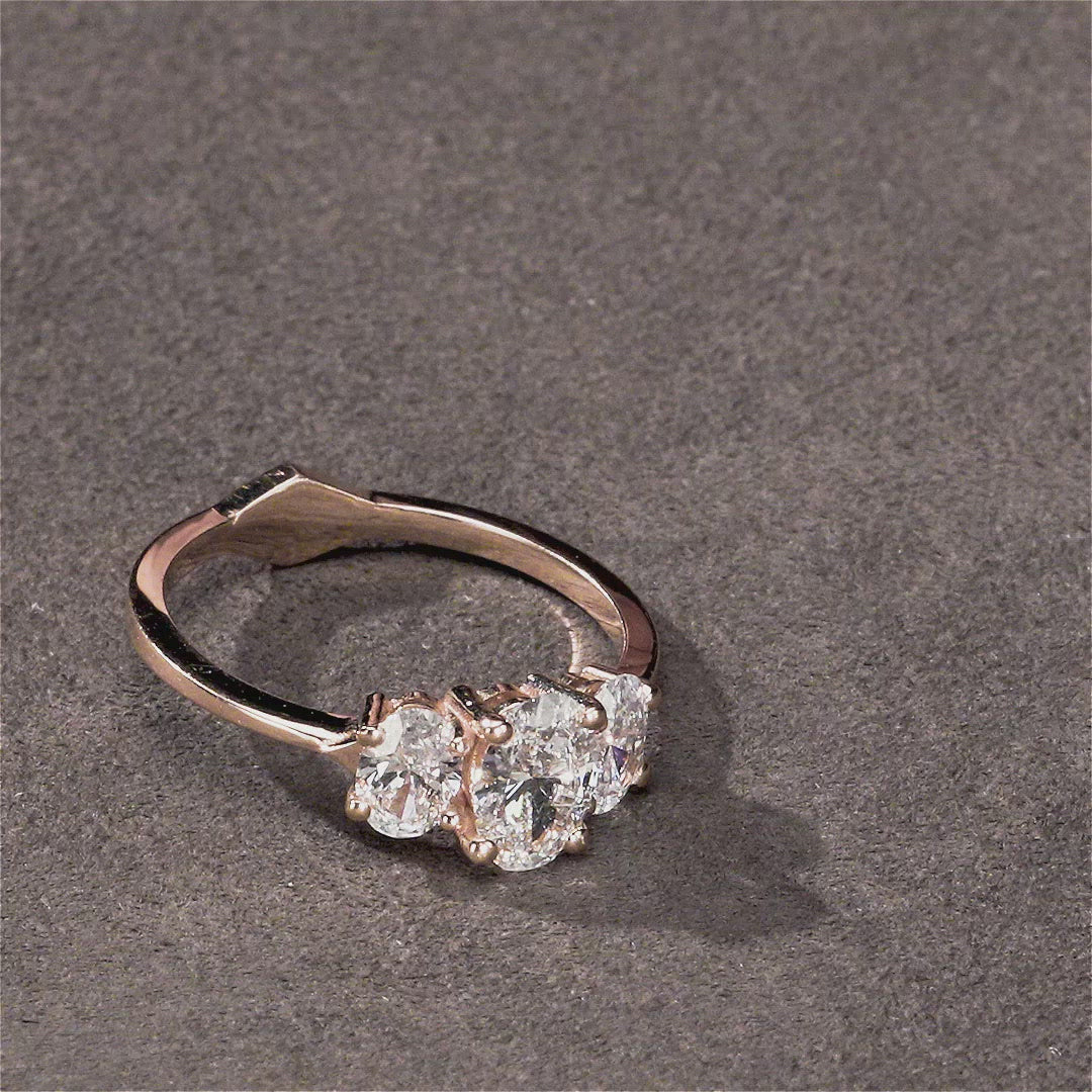 טבעת אירוסין קלאסית המורכבת מיהלום אובאל במרכז ויהלומי טיפה בצדדים, בפרופורציות מושלמות היושבות זו לצד זו.