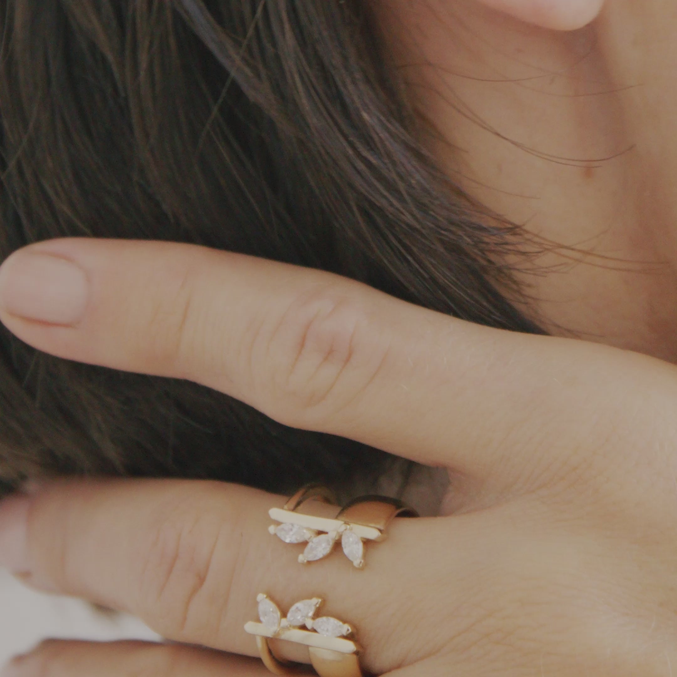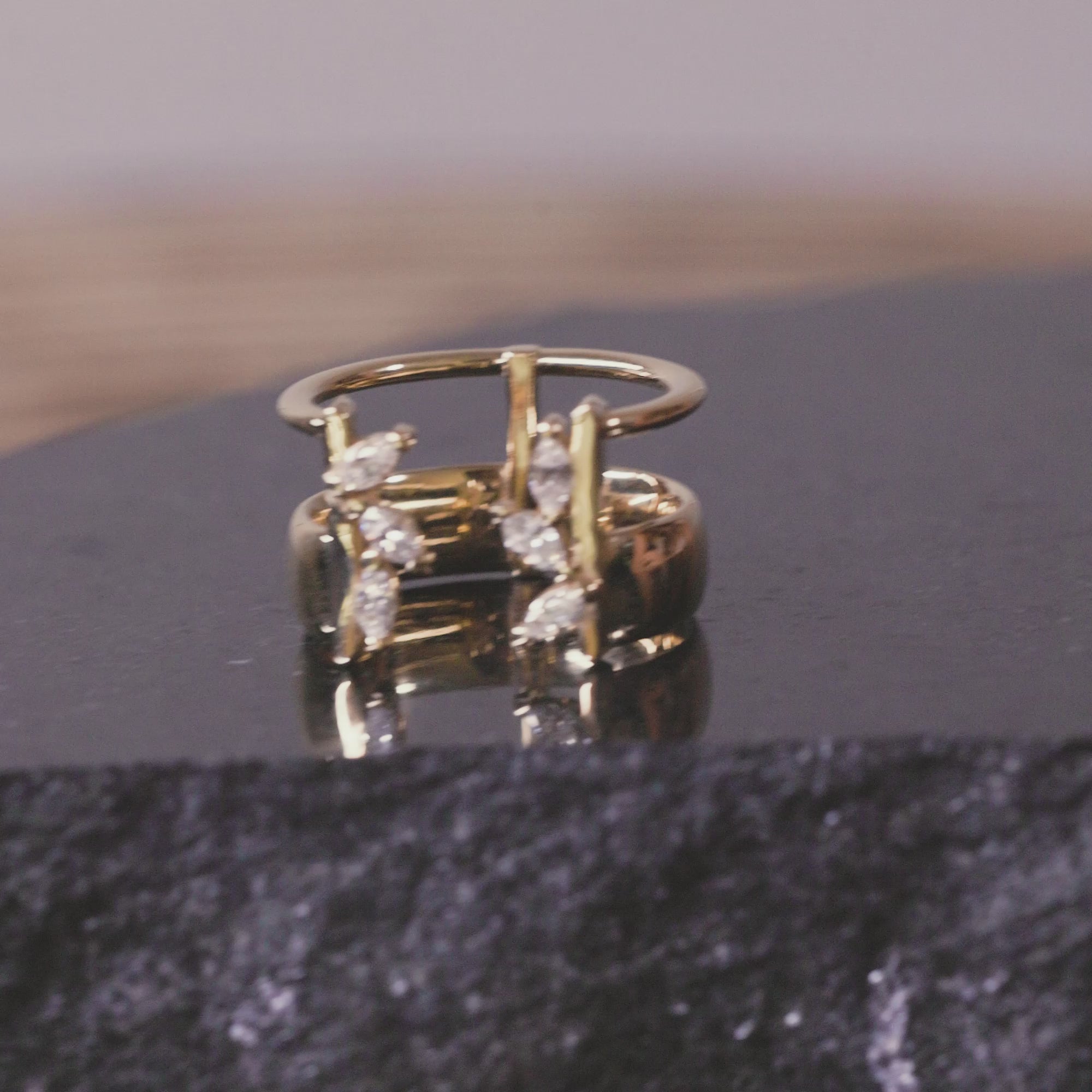 טבעת כפולה בשיבוץ יהלומי מרקיזה משני הצדדים. מושלמת לענידה באצבע או באמה. טבעת עם נוכחות יפה ונוצצת.