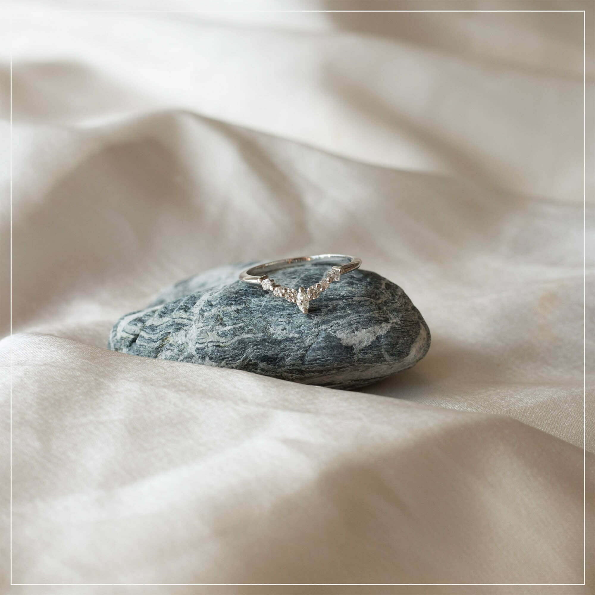 טבעת V ייחודית משובצת 7 יהלומים בפריסה מיוחדת, יהלומים במשקל 0.18-0.20 קראט טוטאל,משובצים בזהב 14 קראט.