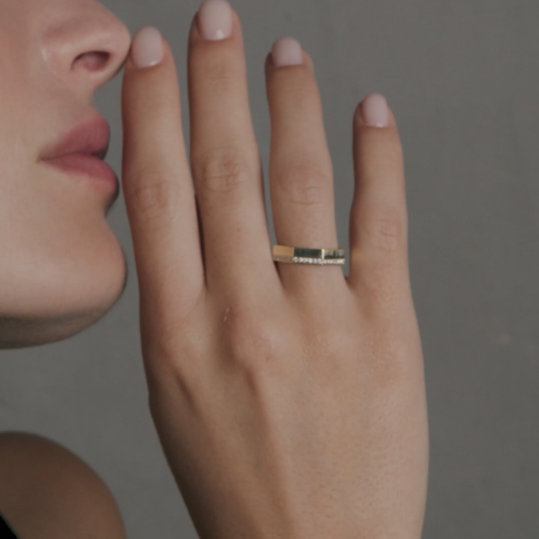 טבעת בצורת מתומן משובצת באלגנטיות ביהלומים על מחצית מרוחב הטבעת.